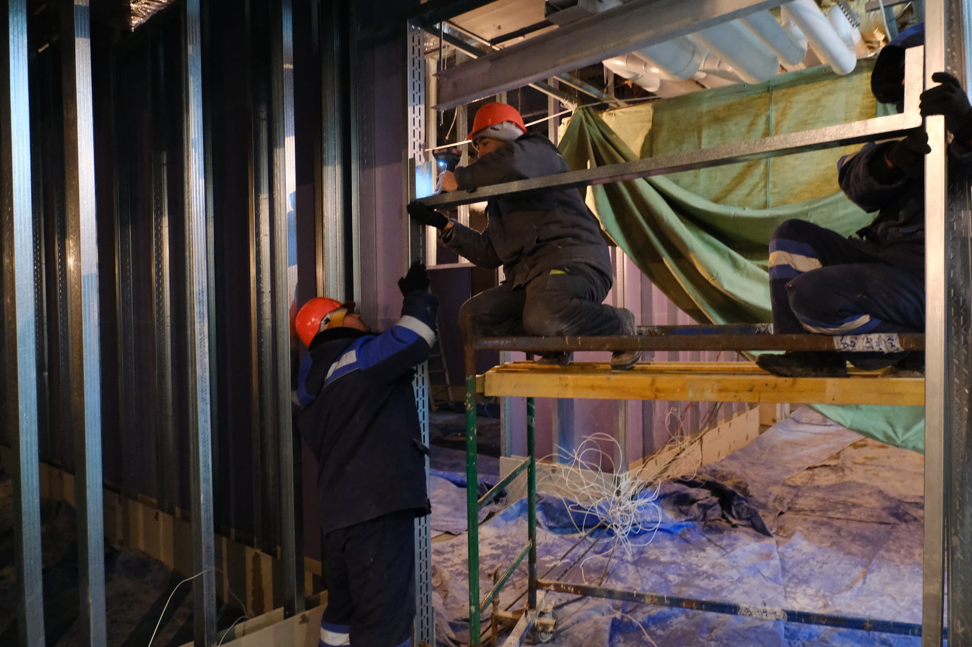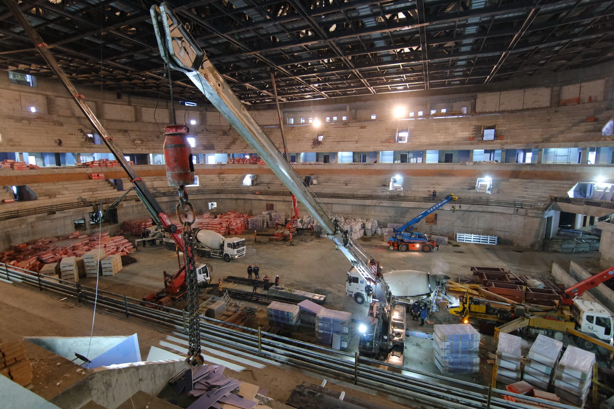 На малой тренировочной арене, куда тепло подали в конце прошлого года, уже достигнуты положительные температуры и рабочие приступили к комплексу работ по устройству полов. Скоро начнется и отделка помещения. 25 января строители обещают подать тепло и в универсальный зал.