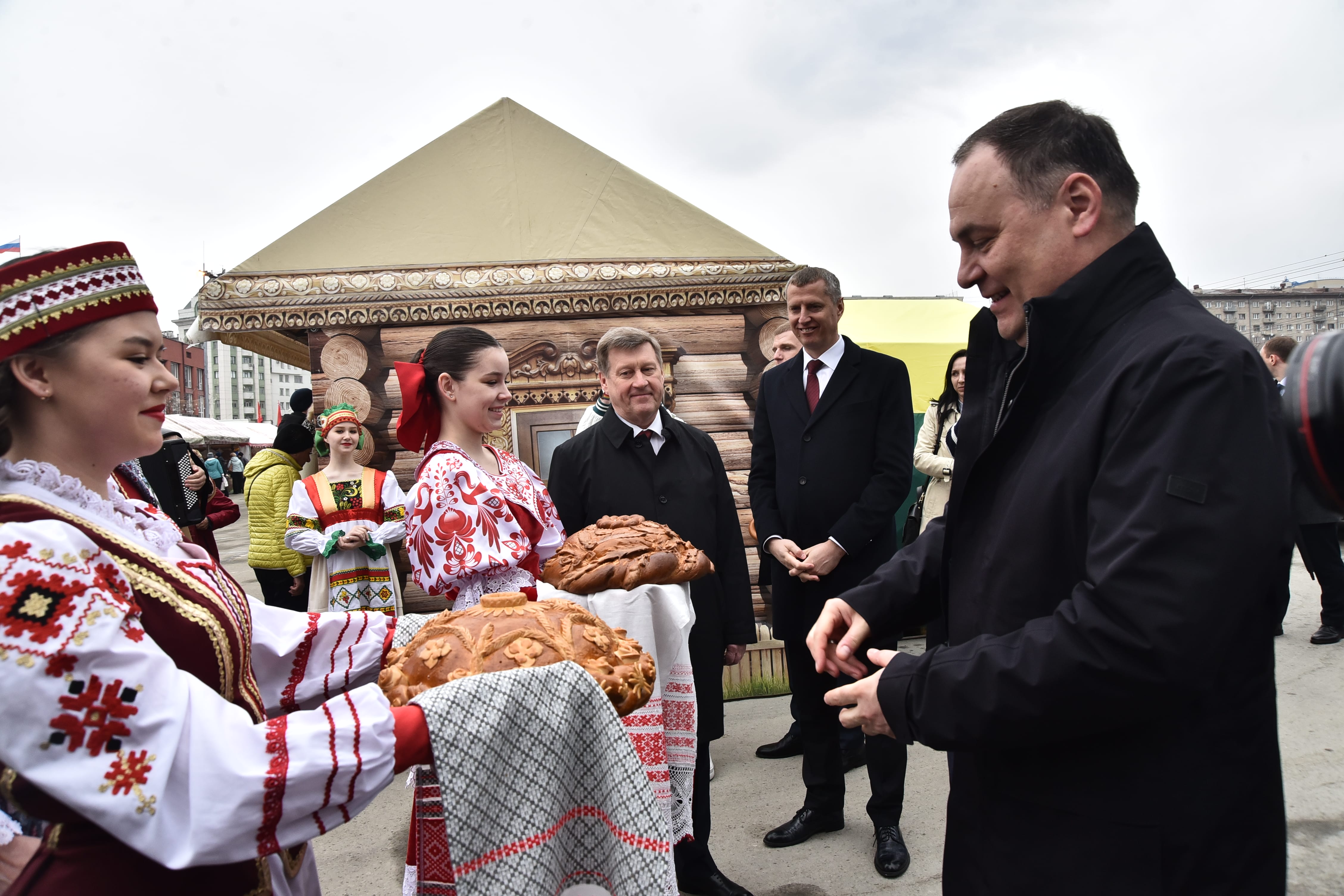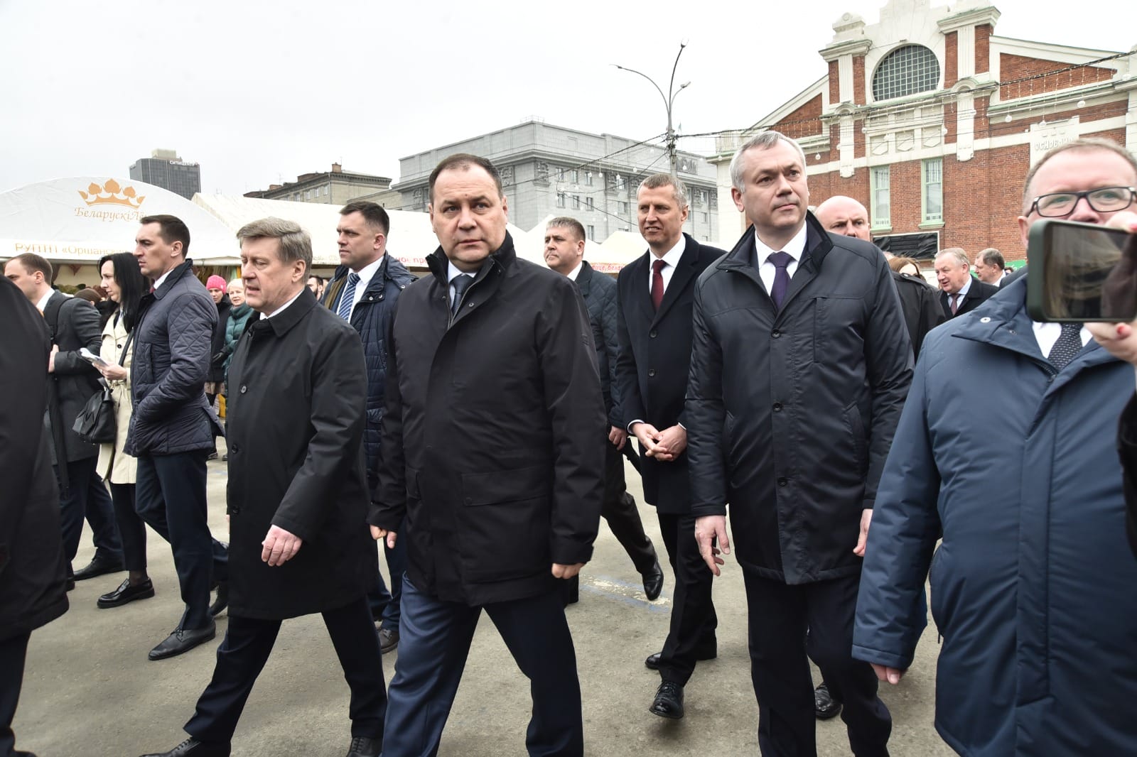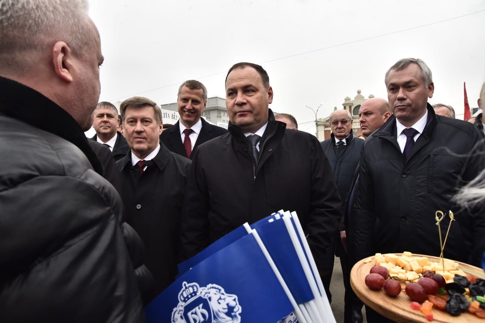 Губернатор Андрей Травников и Премьер-министр Республики Беларусь Роман Головченко посетили ярмарку белорусских товаров на площади Ленина в Новосибирске.
