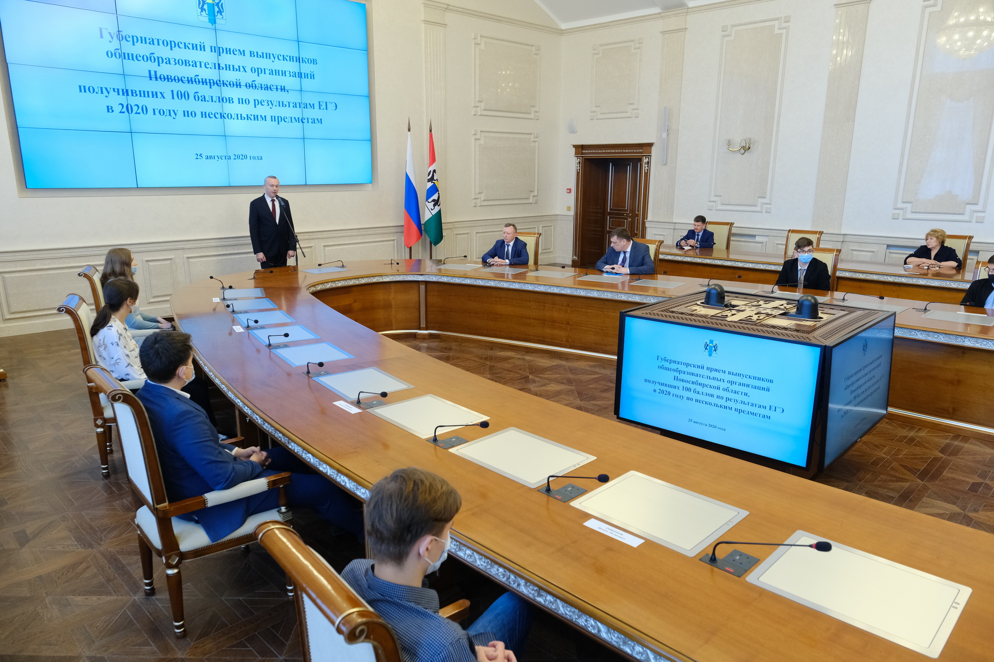 В правительстве Новосибирской области прошёл губернаторский приём, посвящённый чествованию выпускников общеобразовательных организаций, получивших 100 баллов по результатам единого государственного экзамена по нескольким предметам, а также педагогов, подготовивших наибольшее количество выпускников с высокими баллами по результатам ЕГЭ.