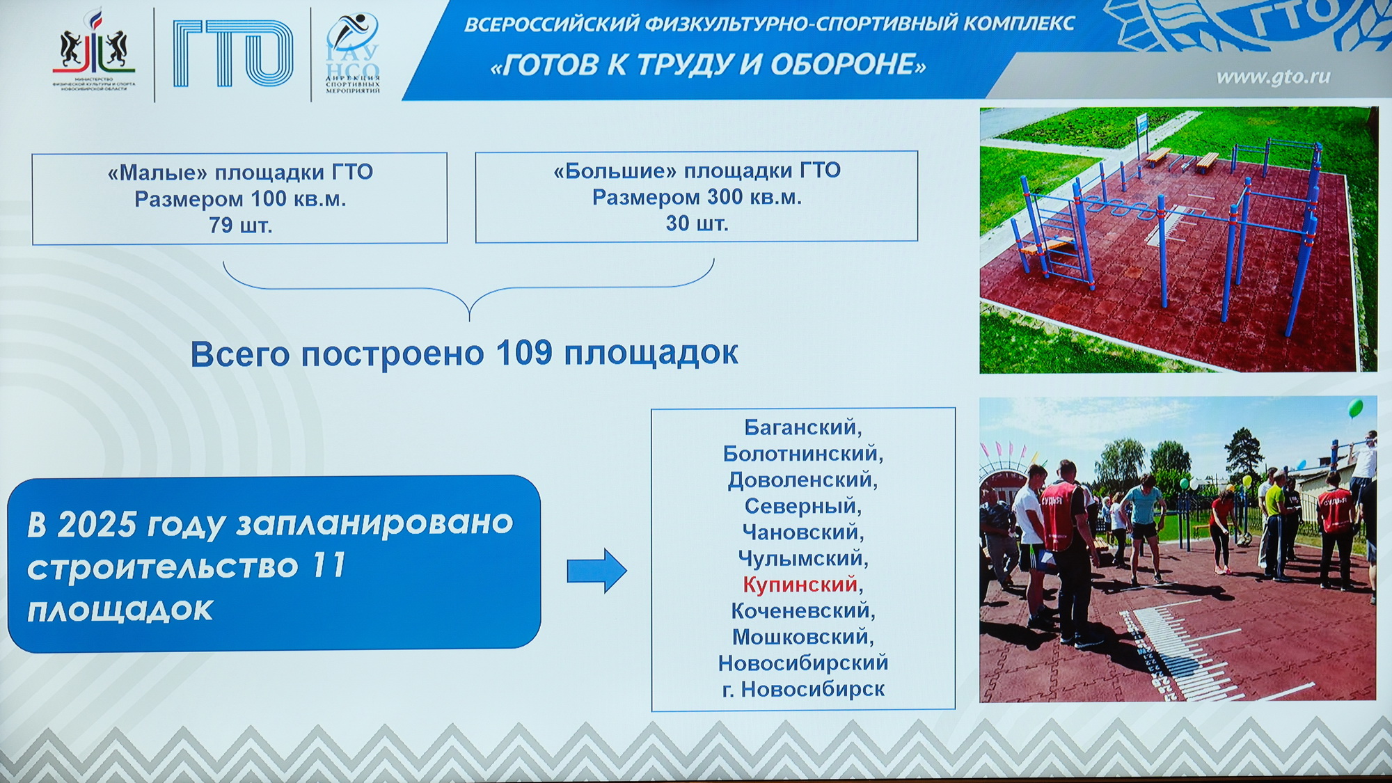 В 2025 году запланировано к реализации 11 площадок ГТО, в том числе 7 «больших» при поддержке средств федерального бюджета (Баганский, Болотнинский, Доволенский, Северный, Чановский, Чулымский районы, одна – в городе Купино – уже завершена), 4 «малых» – за счёт консолидированных средств регионального и муниципальных бюджетов (Коченёвский, Мошковский, Новосибирский районы, г. Новосибирск).