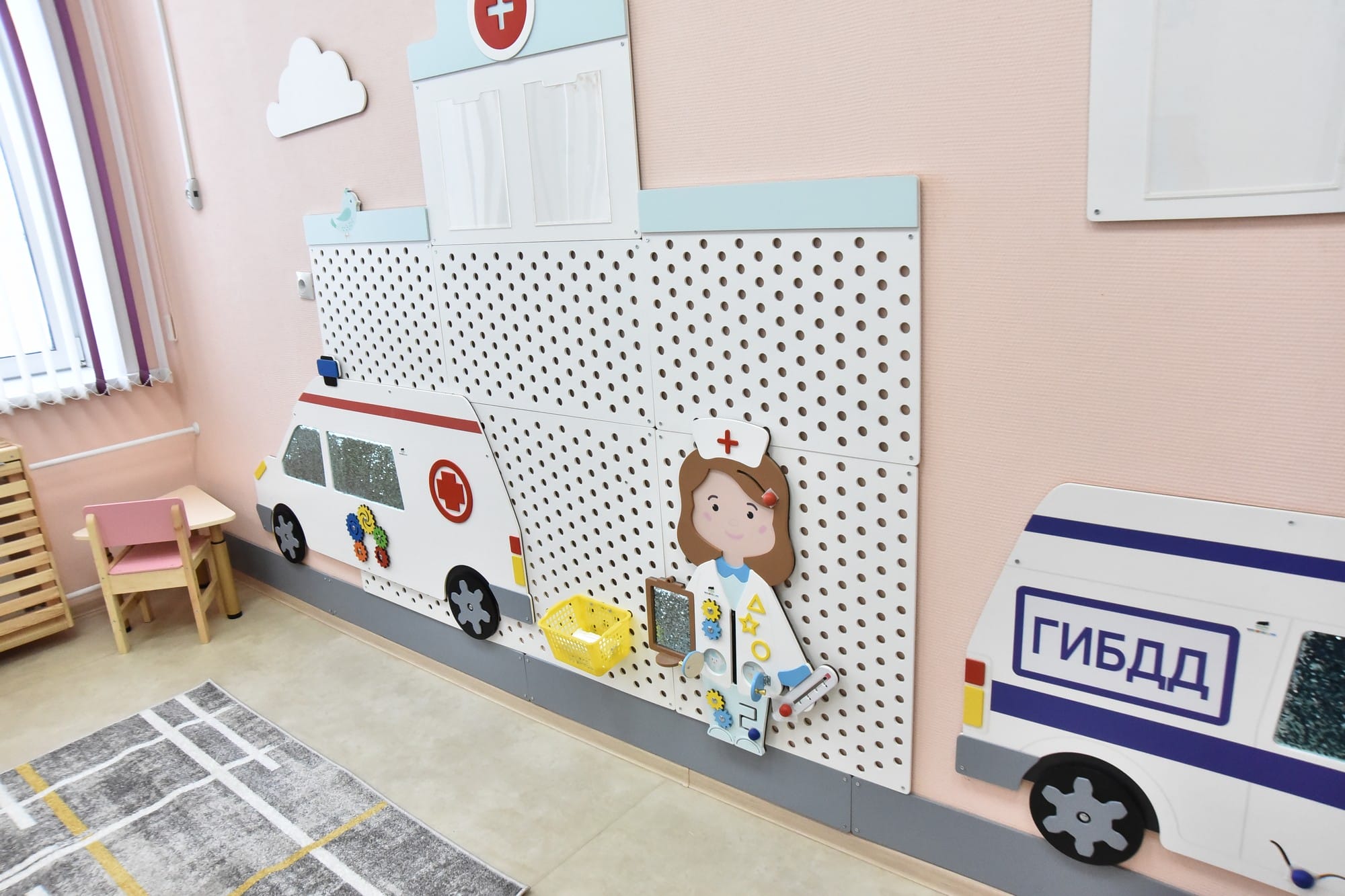 Напомним, что детский сад «Дельфин» на 220 мест был введен в эксплуатацию – тоже в рамках национального проекта «Демография» – в 2019 году, в прошлом году строители завершили возведение дополнительного ясельного корпуса для него. Всё в здании предназначено для самых маленьких воспитанников, рассказала заведующая детским садом Татьяна Щербакова: «В лучшем случае была группа, где делали отдельные зоны для малышей для игры в кухню, в больничку. Здесь помимо того, что такие игровые возможности есть в каждой группе, есть и отдельные кабинеты, где мы можем тематически создать это пространство. Например, ребёнок может познакомиться с миром профессий и будет развивать мелкую моторику, речь, мыслительные операции».