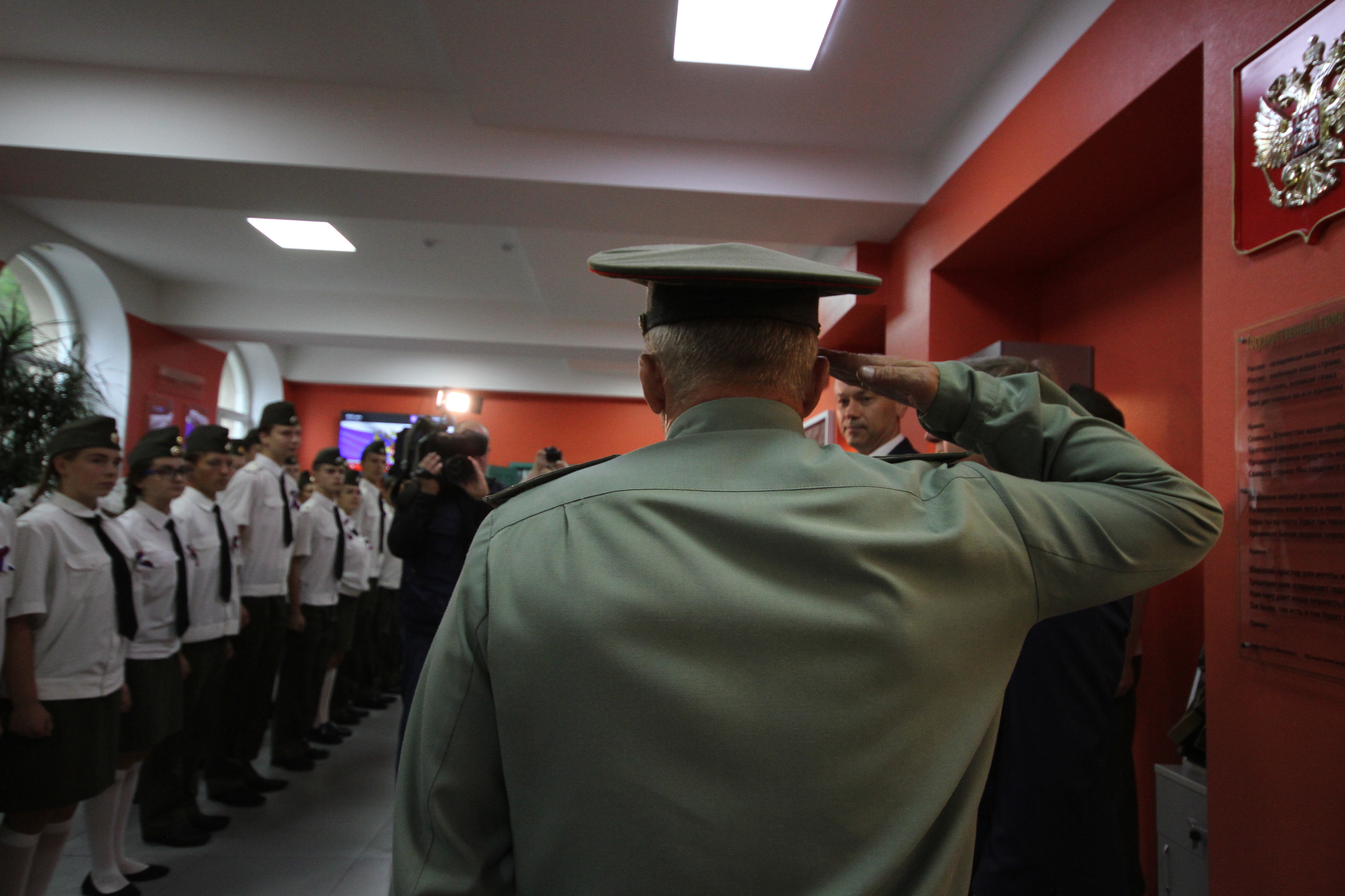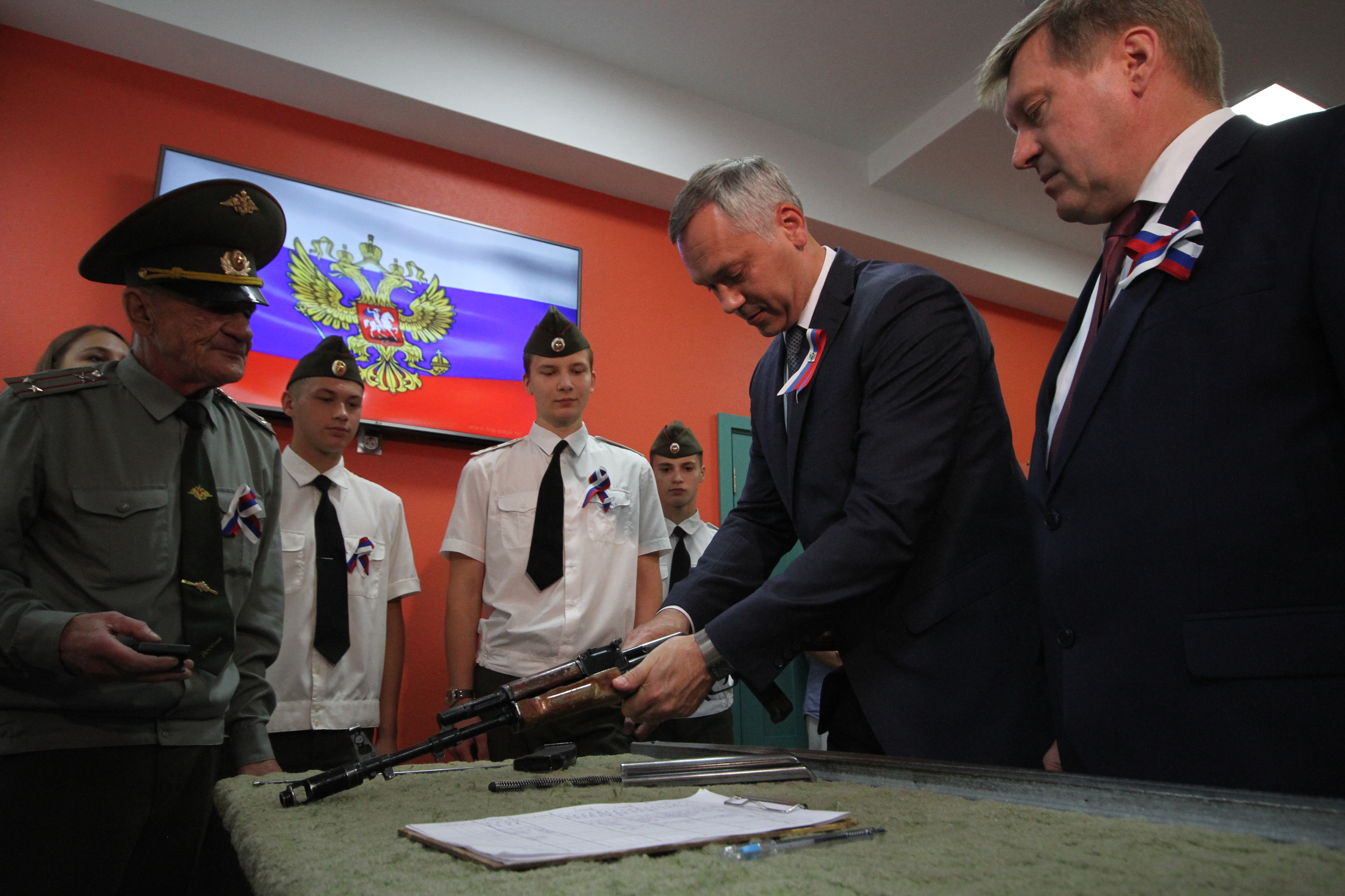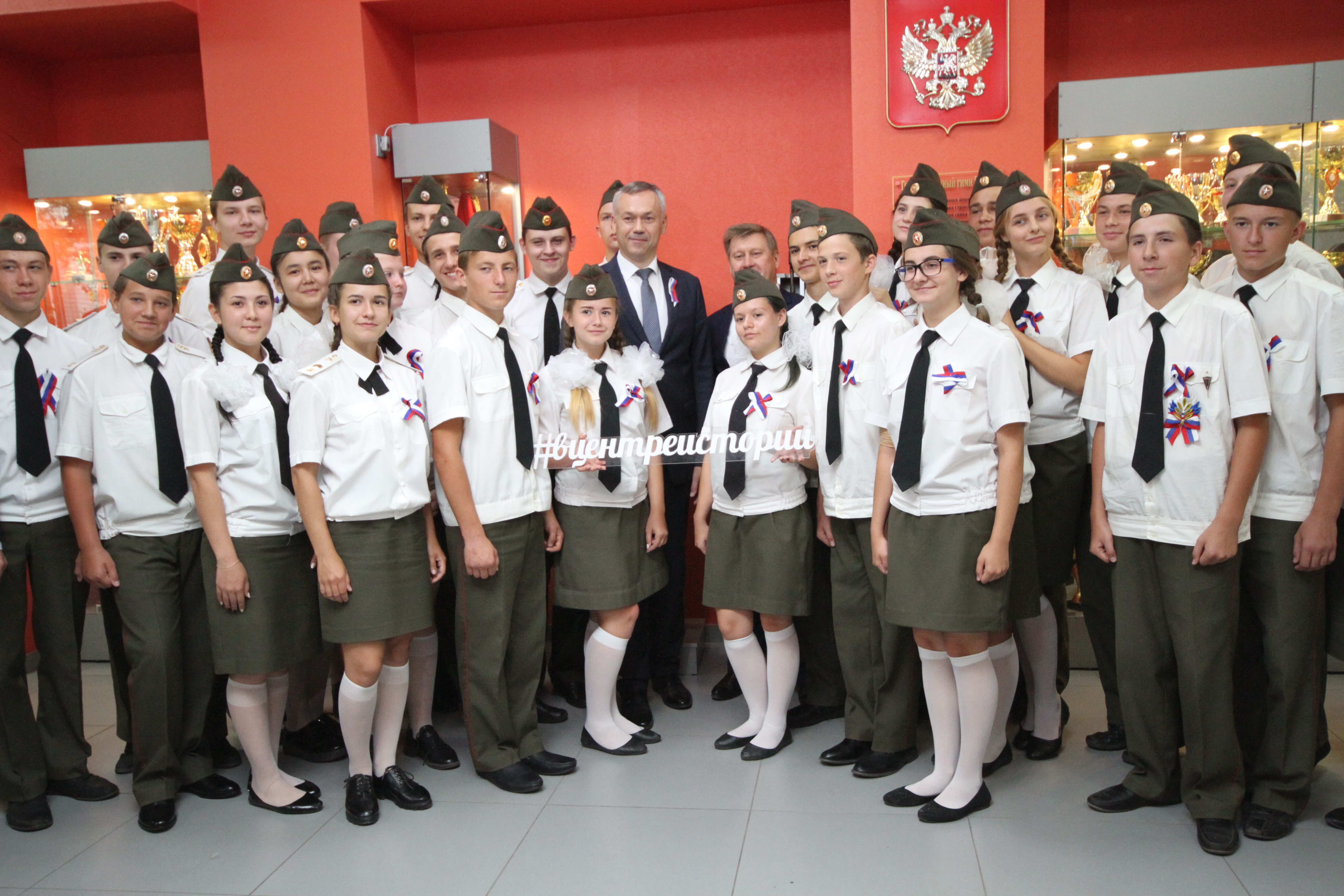 Глава региона Андрей Травников во время рабочей поездки в Ленинский район встретился с курсантами Центра героико-патриотического воспитания «Пост №1» и посетил урок, посвященный истории Государственного флага Российской Федерации.