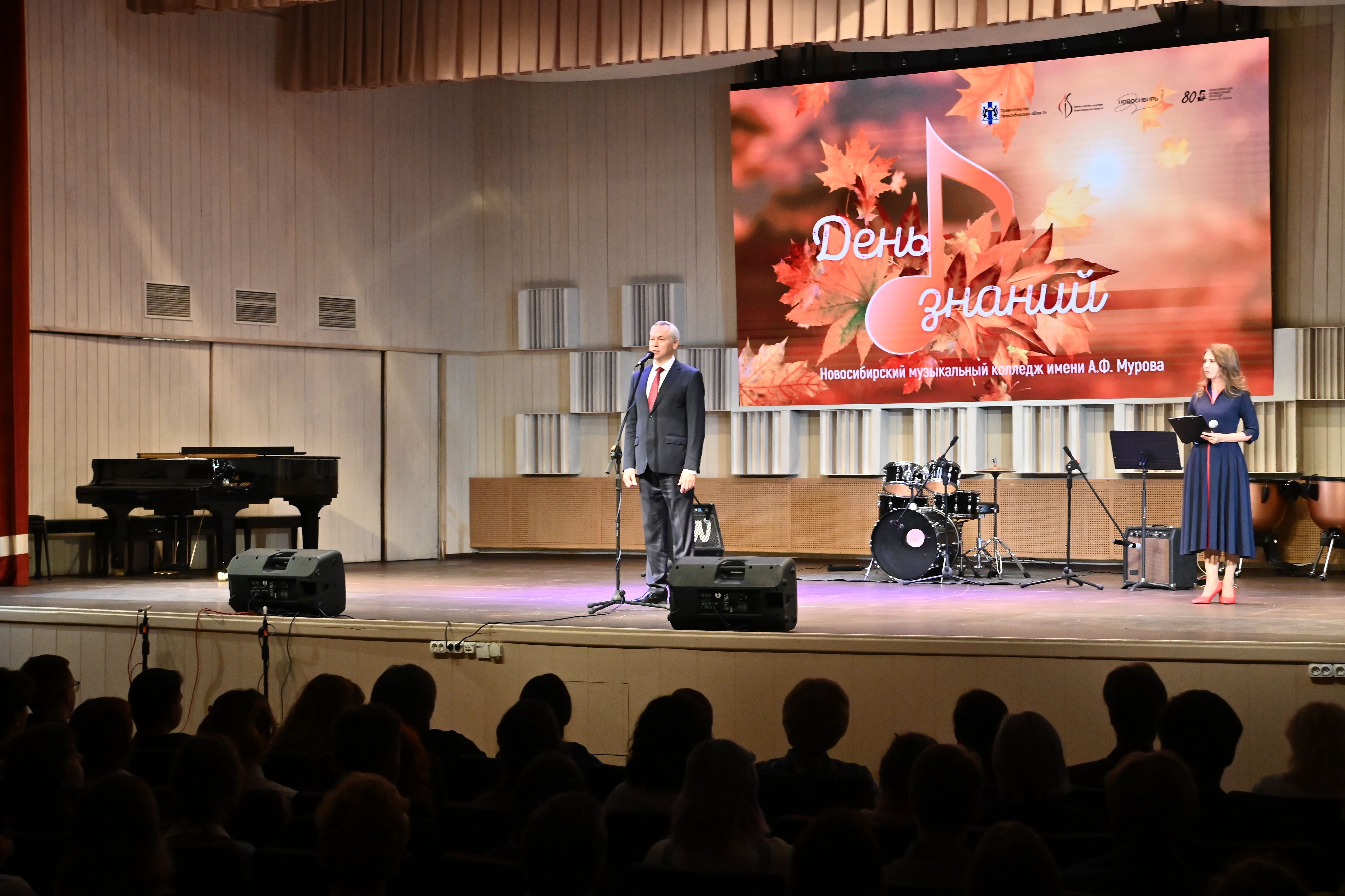 Студентов и преподавателей колледжа имени Аскольда Мурова глава региона поздравил с грядущим юбилеем – второго октября колледж отметит своё 80-летие: «Уверен, новый учебный год продолжит историю замечательного учебного заведения нашего региона. Колледж, а прежде музыкальное училище – ровесник Победы, был создан в 1945 году на основе самобытного коллектива и дополнен мастерством многих именитых исполнителей и коллективов из Ленинграда, которые те годы работали здесь. Это наложило отпечаток на дальнейшее развитие колледжа, это – знаковое учебное заведение, знаковый коллектив, который высоко оценивают приезжающие сюда великие мастера. Училище не просто обладает серьёзным образовательным потенциалом, но уже хорошим мастерством и известными выпускниками. В разных уголках Новосибирской области знают про колледж, он подпитывается традициями и историями народного исполнительского мастерства. Сибирское искусство не стоит на месте, наполняется новыми открытиями, находками, именами. И я уверен: как мы сегодня гордимся многими выпускниками, основателями этого замечательного учебного заведения, так в будущем будем гордиться многими девушками и юношами, которые сегодня познают здесь азы исполнительского искусства, – подчеркнул Андрей Травников.