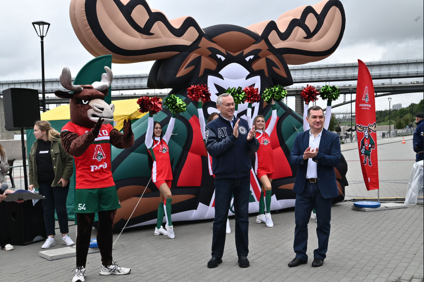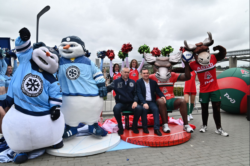 Андрей Травников и Максим Кудрявцев в торжественной обстановке открыли скульптуры талисманов-маскотов двух популярных новосибирских спортивных команд – хоккейной «Сибири» и волейбольного «Локомотива».