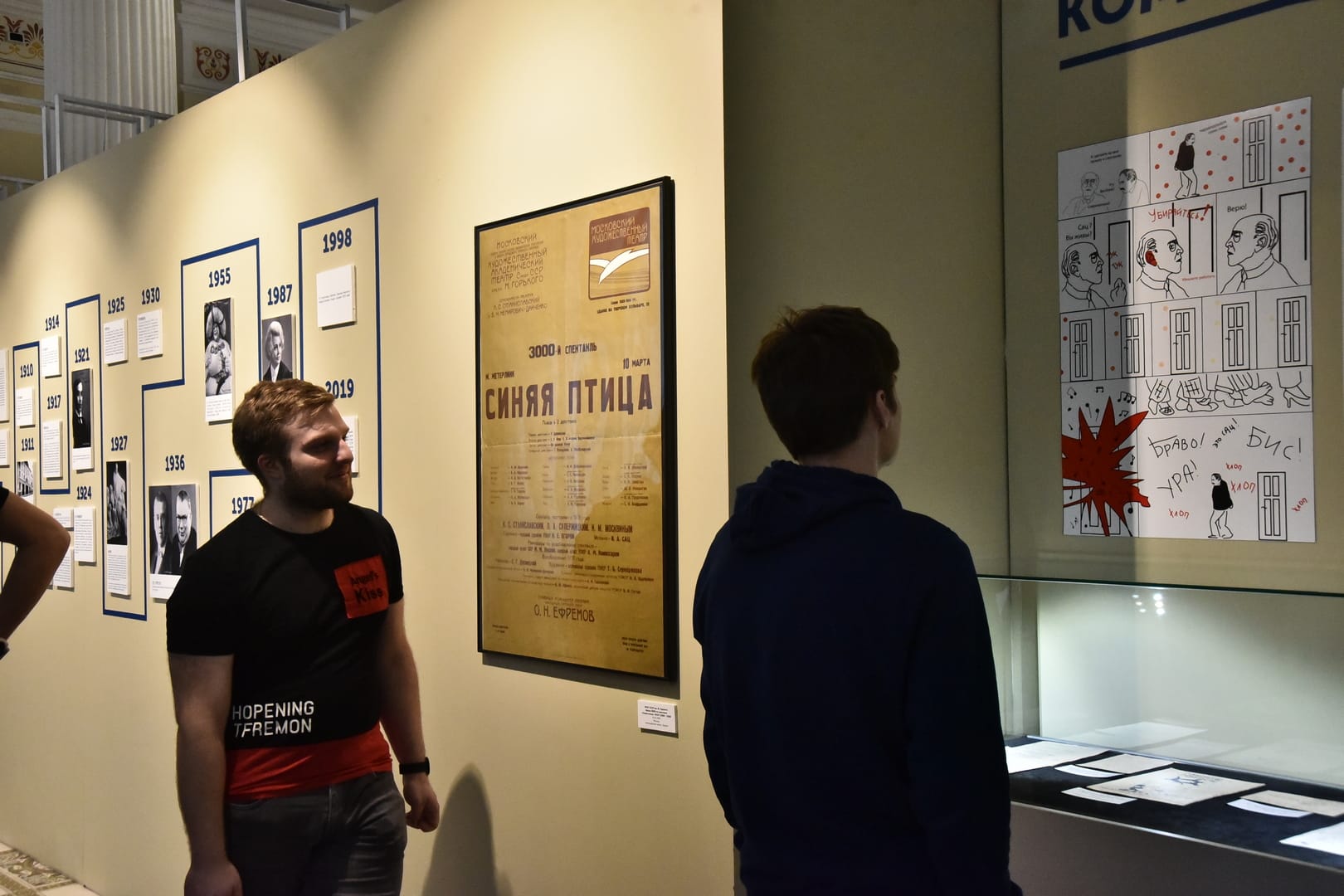 На выставке, посвященной созданию спектакля «Синяя птица», представлены более 100 предметов из фондов музея Московского художественного академического театра в Москве (МХАТ) – подлинные фотографии и сценические костюмы, оригиналы и копии документов режиссерских записей, переписок, эскизов, набросков, звучит оригинальная музыка к спектаклю.