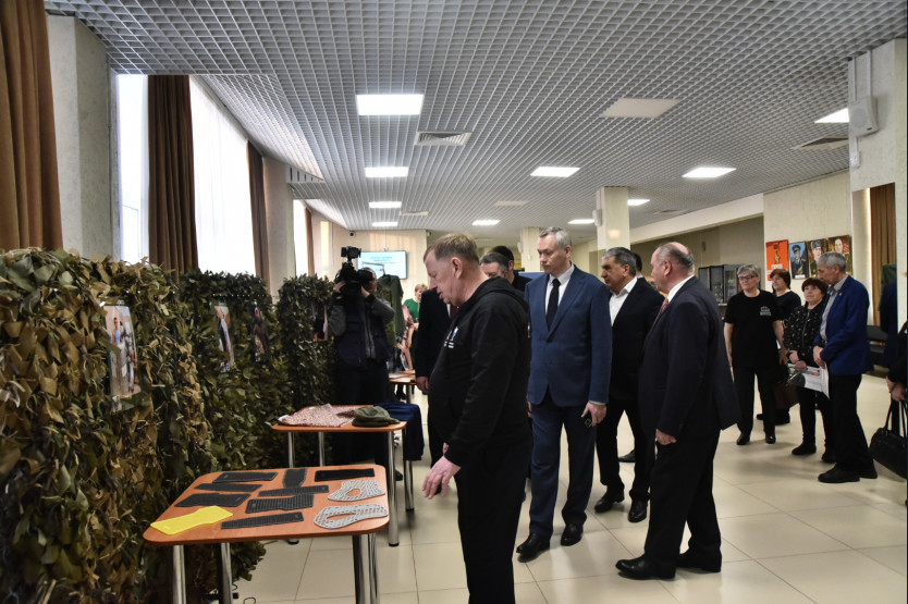 В Краснозерском Доме культуры Губернатор встретился с активом волонтёрских объединений, посетил выставку продукции, изготавливаемой для нужд СВО, центр плетения маскировочных сетей.