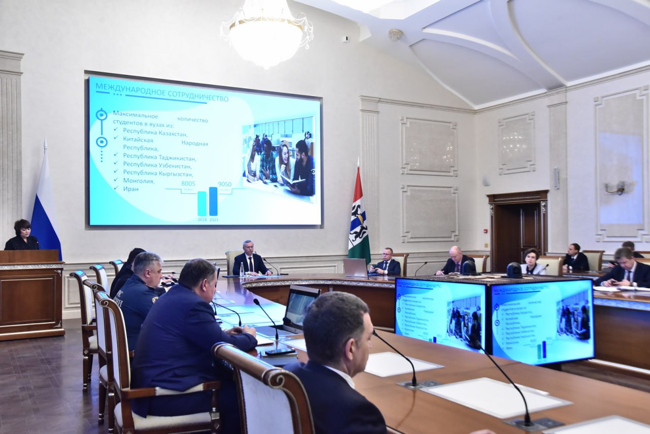 Губернатор провёл оперативное совещание в Правительстве региона. С докладом о развитии системы высшего образования Новосибирской области выступила министр образования региона Мария Жафярова.