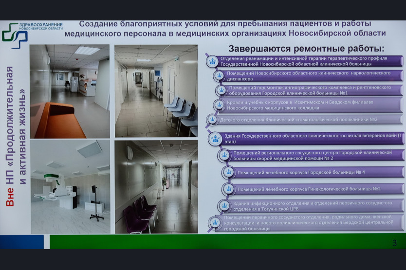 В 2025 году минздрав завершает ремонтные работы более чем в 60 медицинских организациях. Наиболее масштабные: отделение реанимации и интенсивной терапии в Государственной областной клинической больнице, помещение областного клинического наркологического диспансера, помещение под монтаж ангиографического комплекса и рентгеновского оборудования Городской больницы №1, капитальный ремонт кровли учебных корпусов в Искитимском и Бердском филиалах Новосибирского медицинского колледжа, детского отделения клинической стоматологической поликлиники №2, помещение регионального сосудистого центра Городской клинической больницы скорой медицинской помощи №2, помещение лечебного корпуса Городской больницы №4, лечебного корпуса гинекологической больницы №2, здание инфекционного отделения и первичного сосудистого отделения в Тогучинской ЦРБ, помещения первичного сосудистого отделения родильного дома, женской консультации и нового поликлинического отделения Бердской ЦГБ. Продолжается капремонт здания Государственного областного клинического госпиталя ветеранов войн. Идёт обследование конструкций здания Детской городской клинической больницы №1 на Вертковской с целью определения стоимости капитального ремонта.