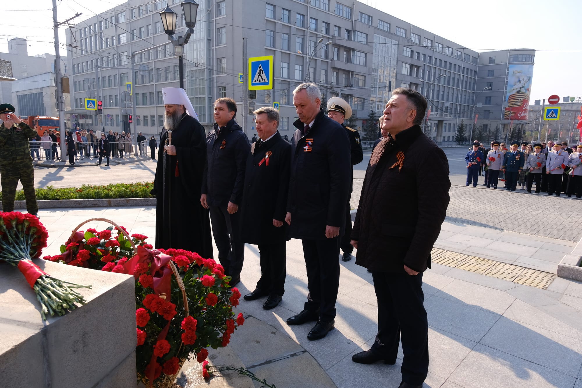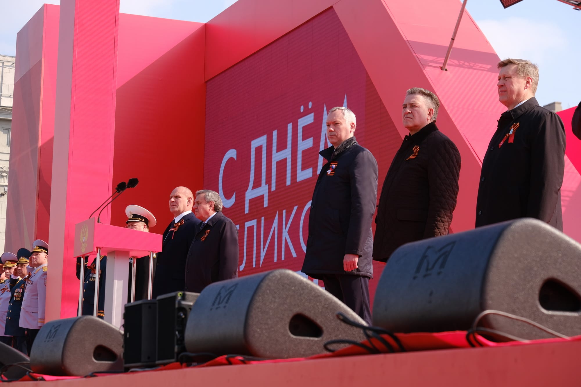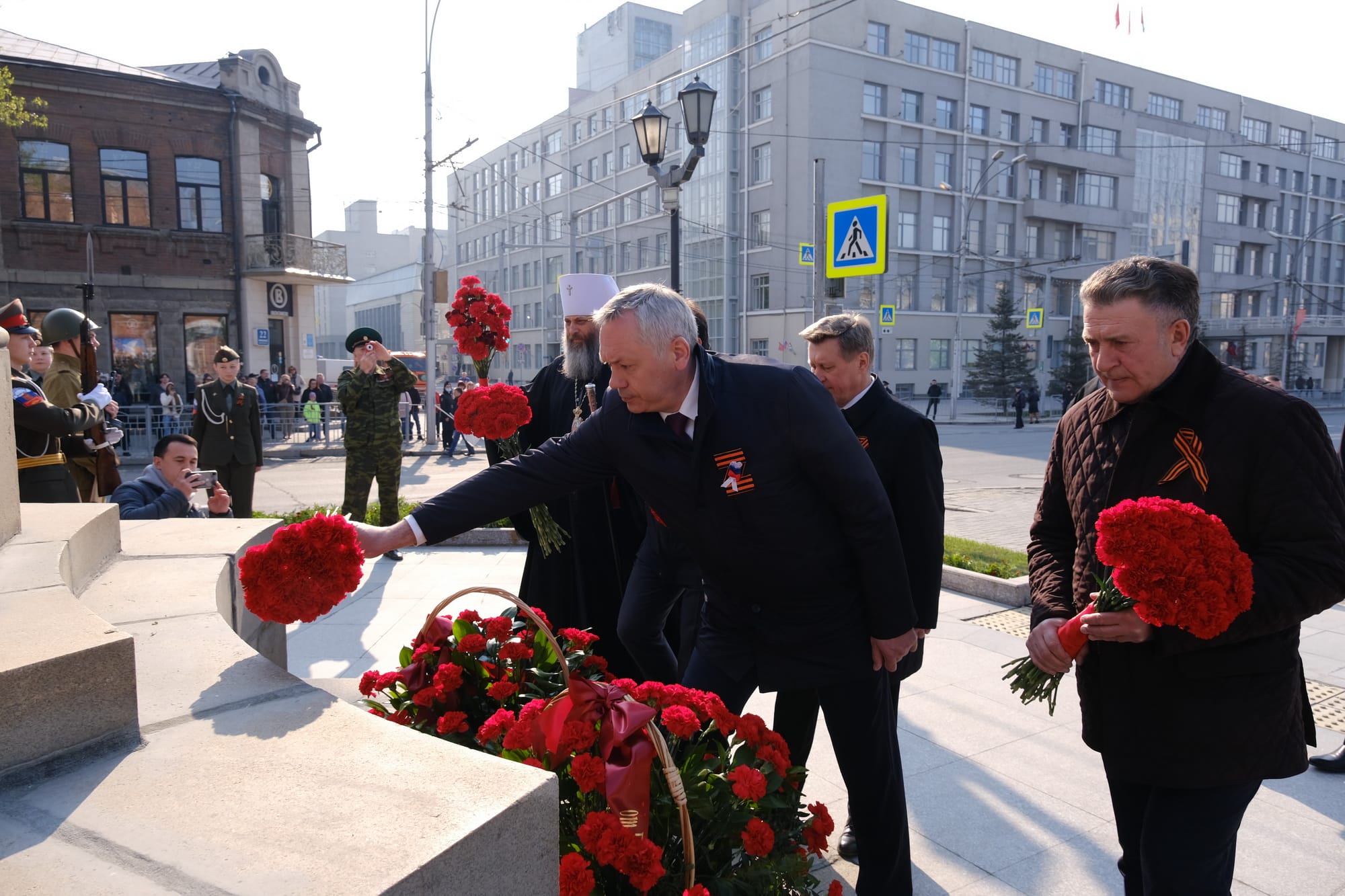 Андрей Травников вместе с новосибирцами возложил цветы к бюсту маршала авиации, трижды Героя Советского Союза Александра Покрышкина, на площади имени Ленина наблюдал за военным парадом.