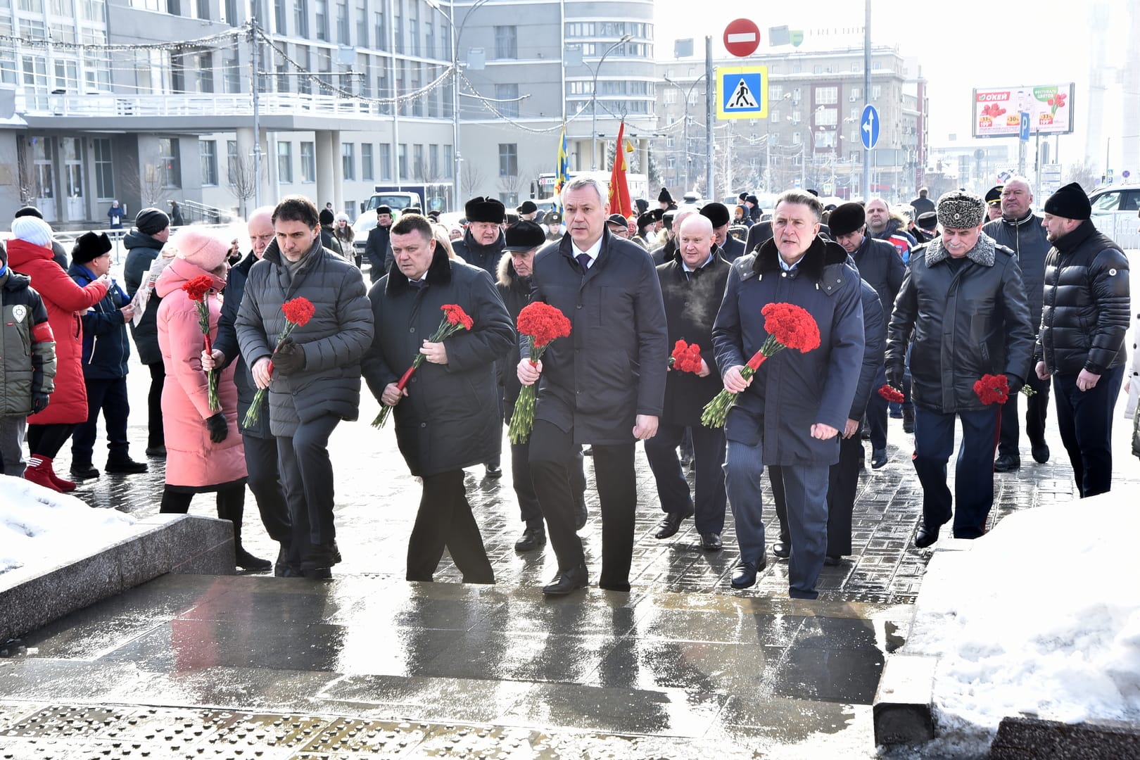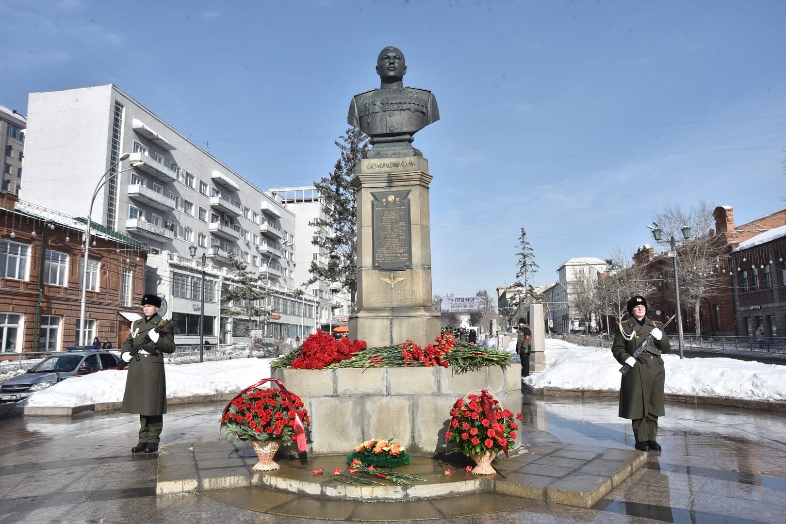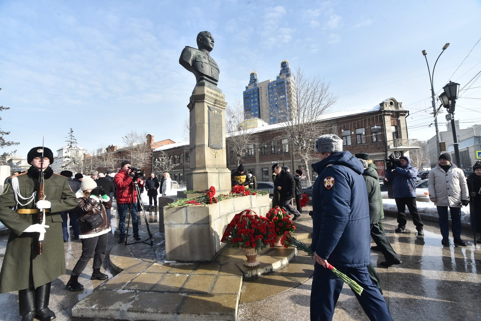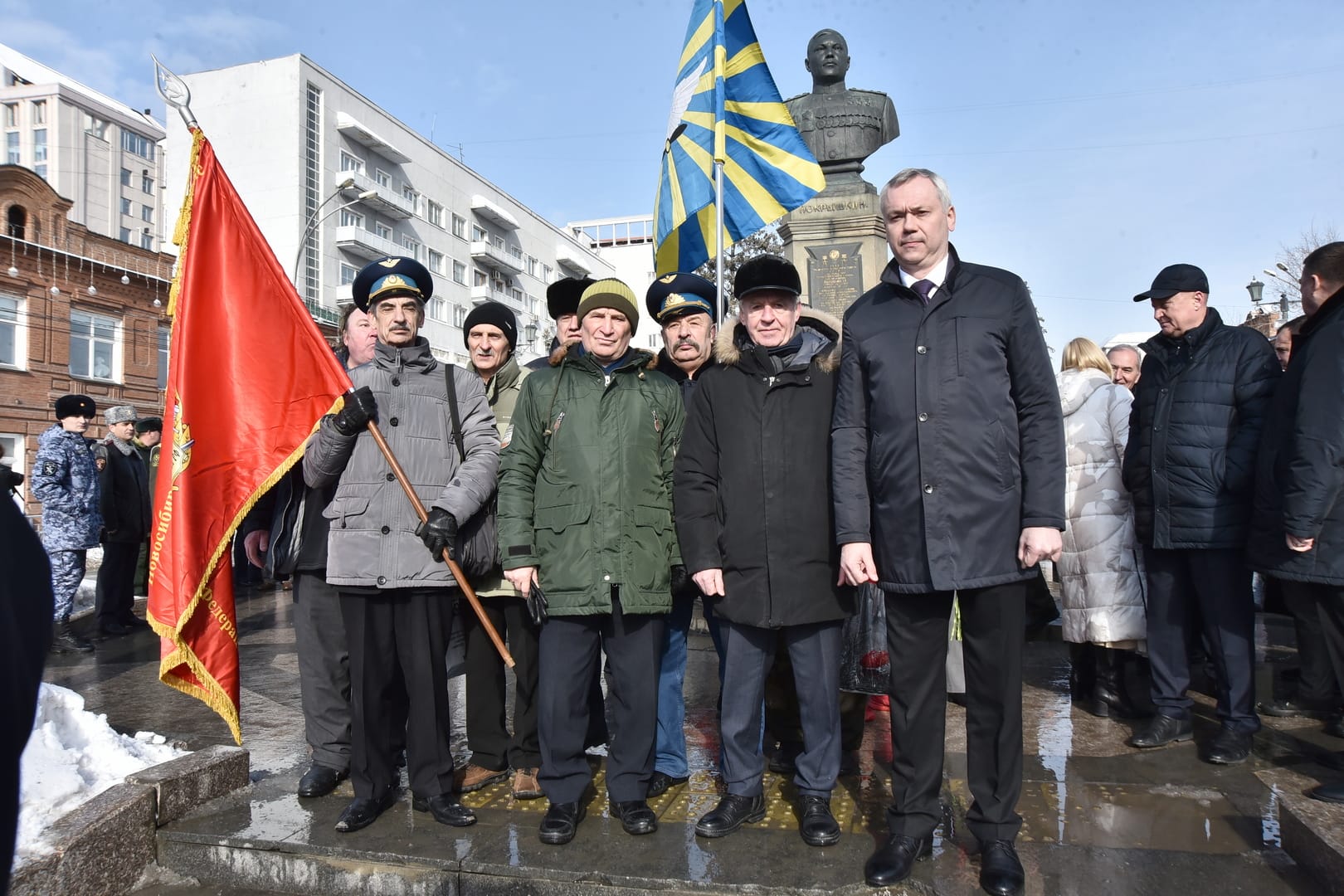 Губернатор Андрей Травников, Председатель Законодательного Собрания Новосибирской области Андрей Шимкив, сенаторы Совета Федерации ФС РФ Александр Карелин и Владимир Городецкий и другие официальные лица приняли участие в церемонии возложения венков и цветов к бюсту первого в истории трижды Героя Советского Союза, Маршала авиации, уроженца Новониколаевска-Новосибирска Александра Ивановича Покрышкина.