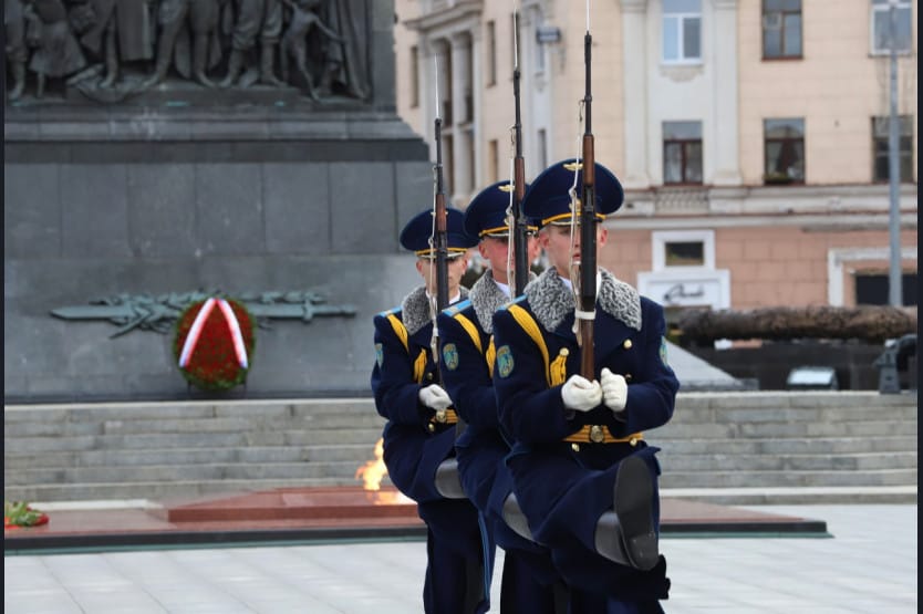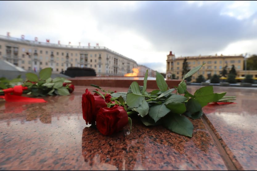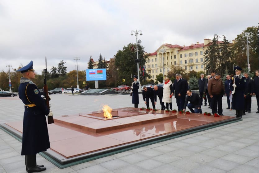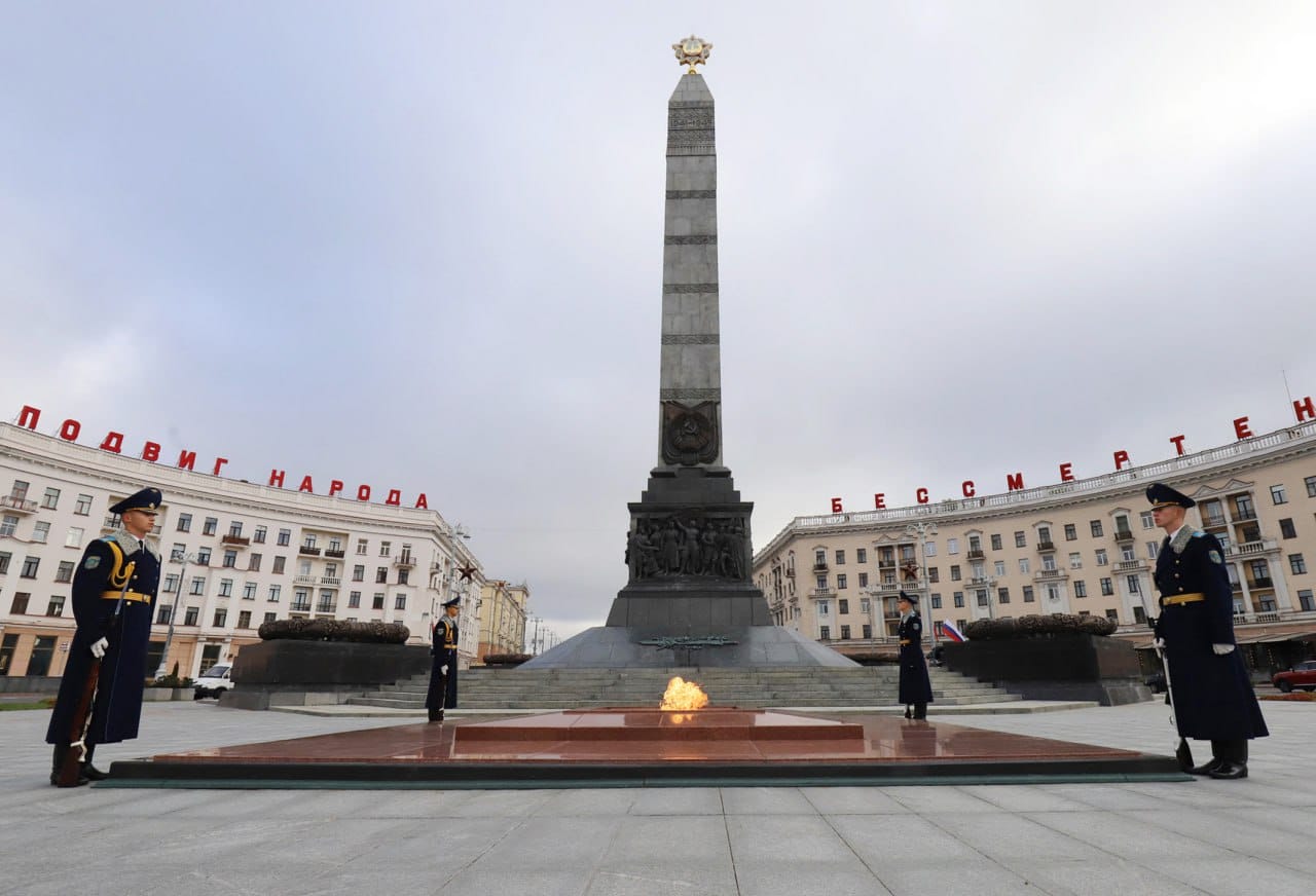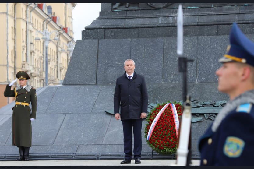 Члены Новосибирской делегации во главе с Губернатором и вместе с заместителем председателя Минского горисполкома Артёмом Цураном возложили венки и цветы к Монументу Победы и Вечному огню в Минске на площади Победы.