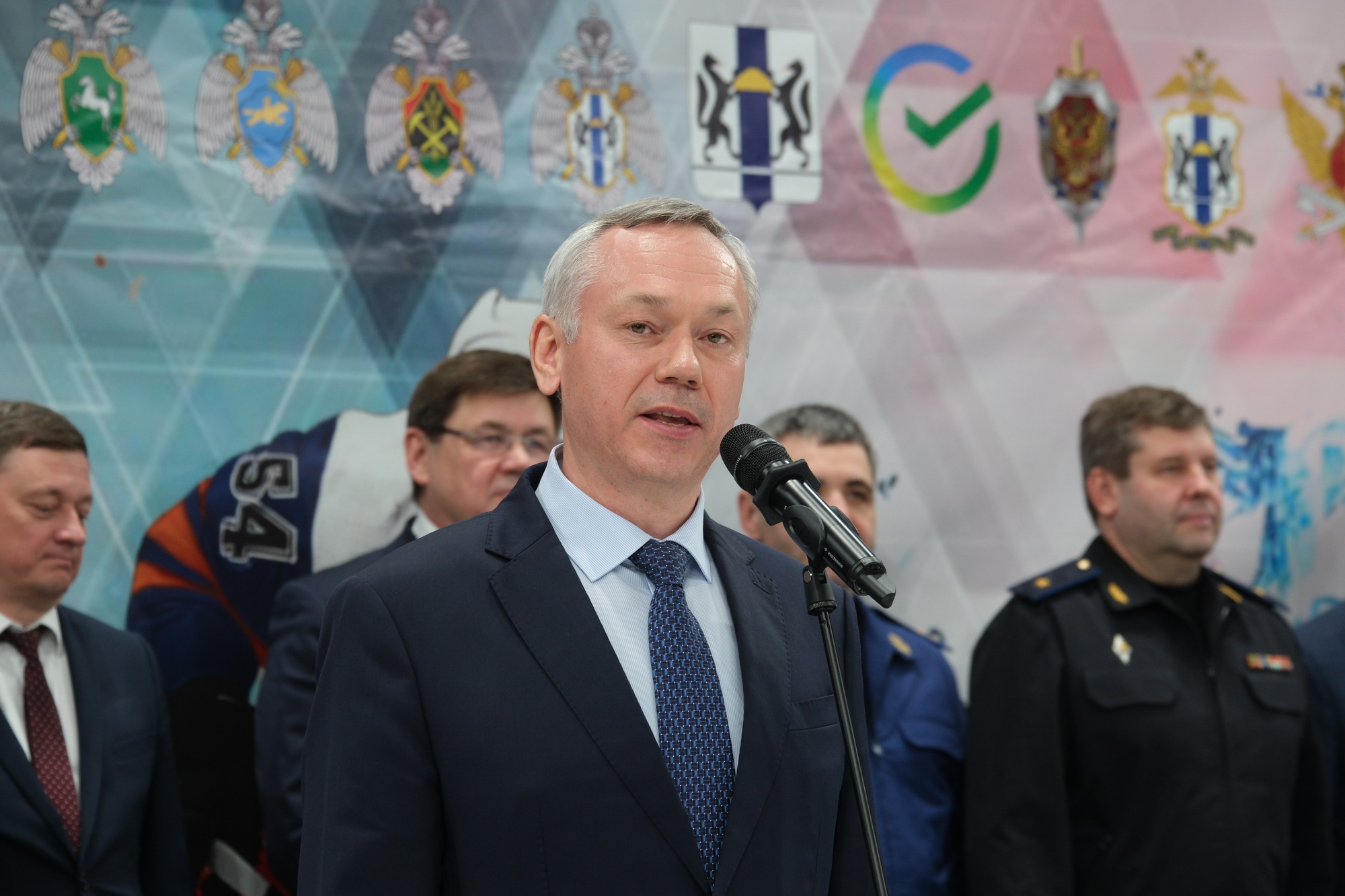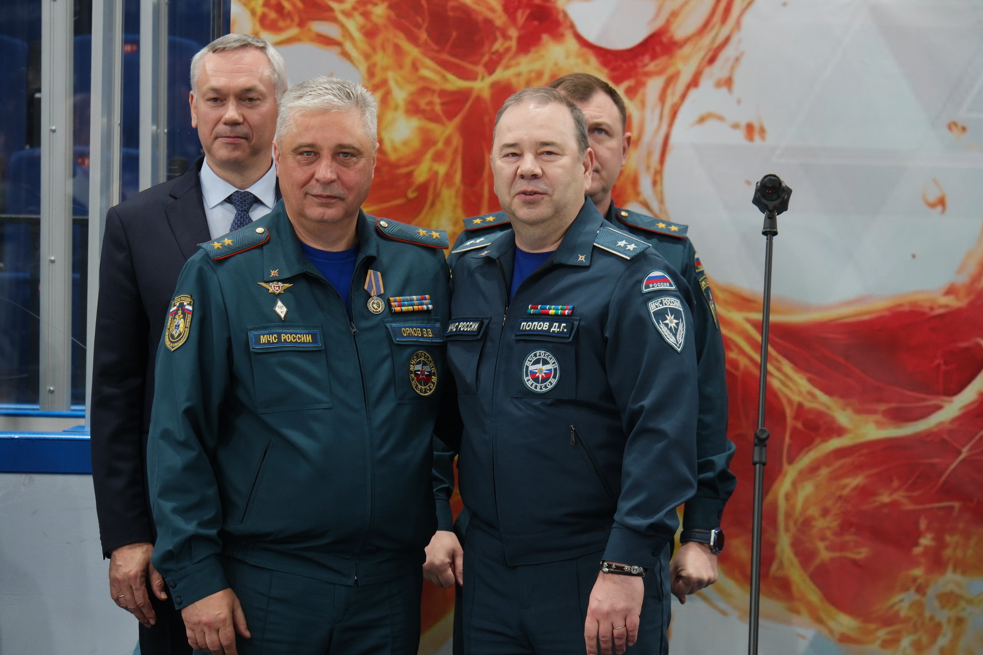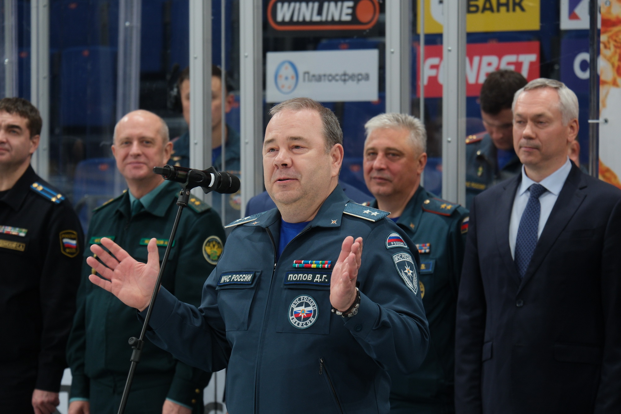 Губернатор Новосибирской области Андрей Травников, статс-секретарь – заместитель Министра МЧС России Денис Попов, заместитель Министра по делам гражданской обороны, чрезвычайным ситуациям и ликвидации последствий стихийных бедствий Вячеслав Бутко и начальник Главного управления МЧС России по Новосибирской области Виктор Орлов приняли участие в церемонии закрытия-награждения турнира по хоккею с шайбой на льду среди территориальных органов МЧС России Сибирского федерального округа, Правительства Новосибирской области и силовых ведомств Новосибирской области.