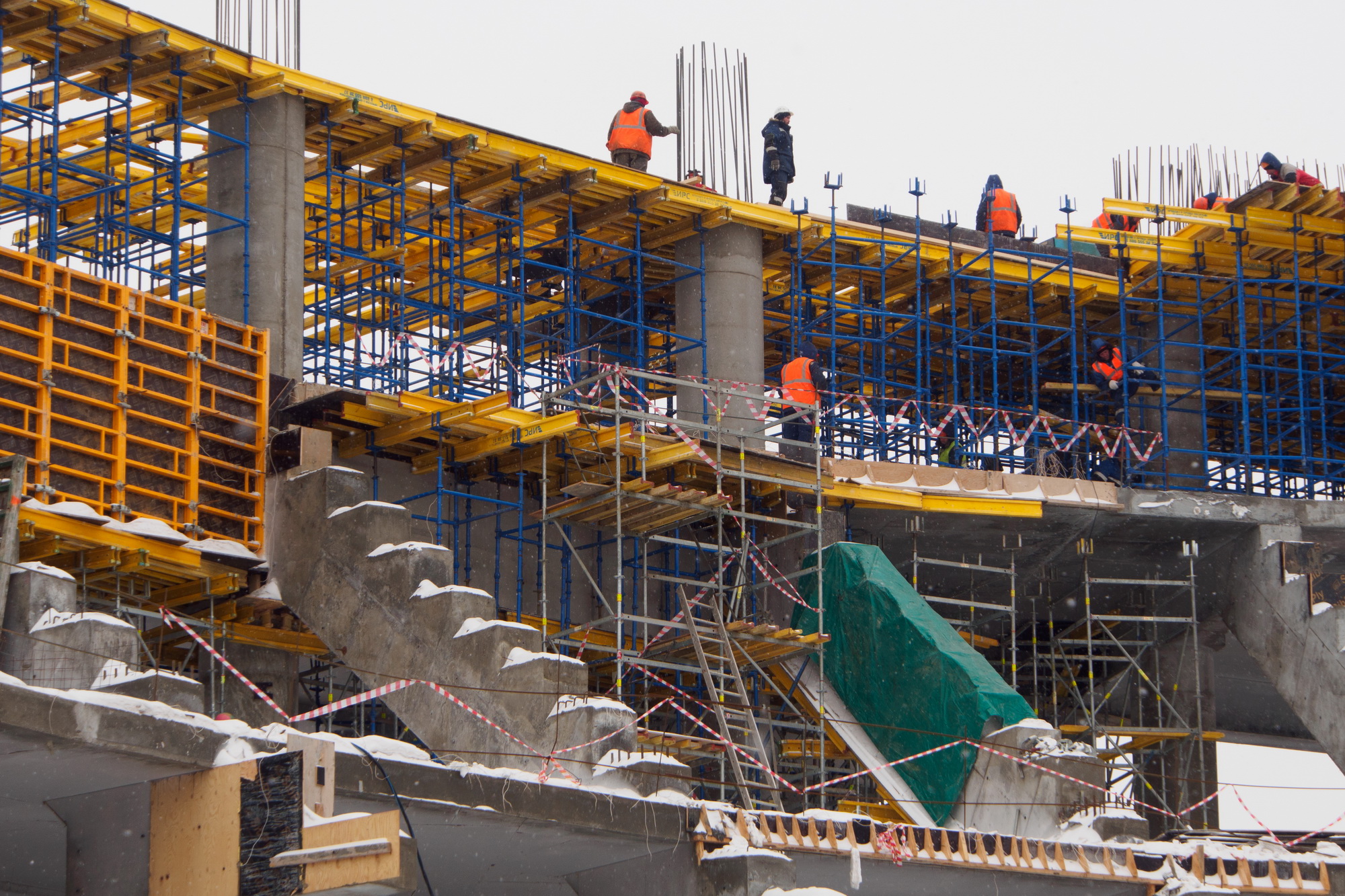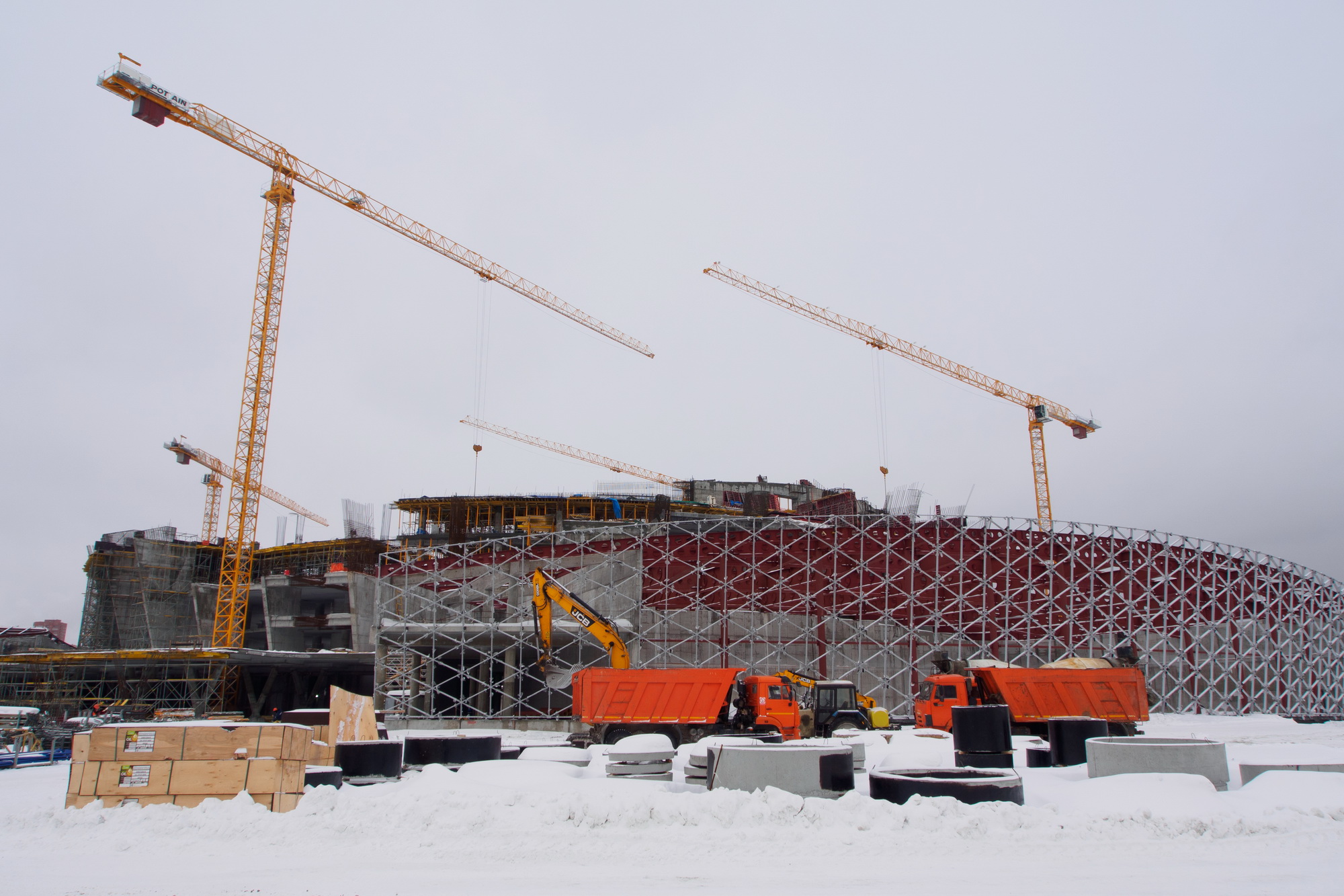 На объекте могут впечатлить не только масштабы строительства или количество используемых для строительства материалов: параллельно идёт сразу несколько видов работ.