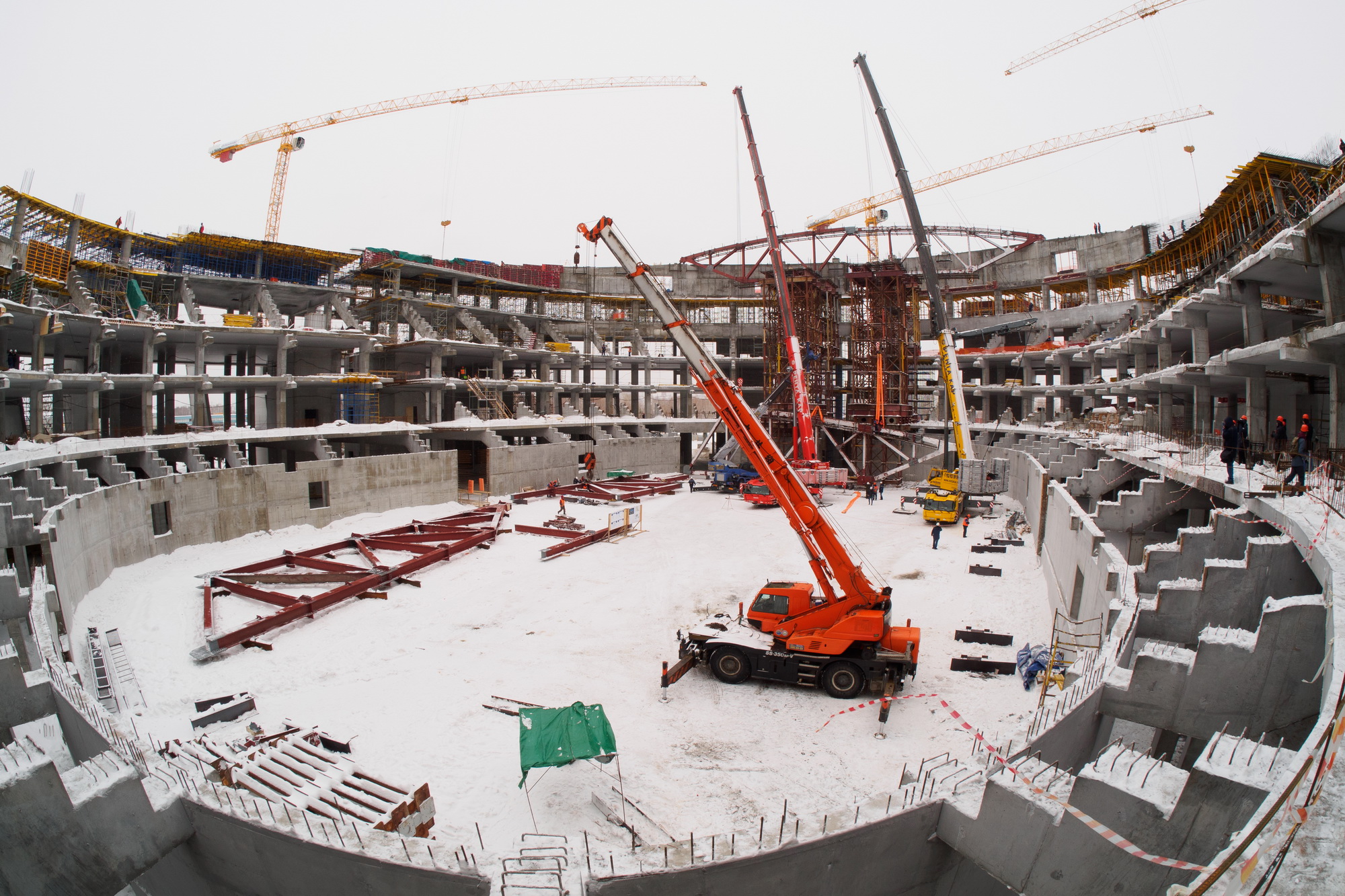Главе региона доложили: начался монтаж металлических ферм перекрытия. Длина самой маленькой смонтированной фермы составляет 58,25 метра, масса — 75 тонн. Если первую ферму строители монтировали одним краном, то для монтажа последующих конструкций необходима работа двух синхронизированных кранов. Вес конструкции таков, что один кран просто не сможет её поднять. Уже в июле, по словам строителей, завершится монтаж металлоконструкций, суммарный вес которых составит три тысячи тонн (2300 тонн – на основной арене и 700 – в периферийной части).