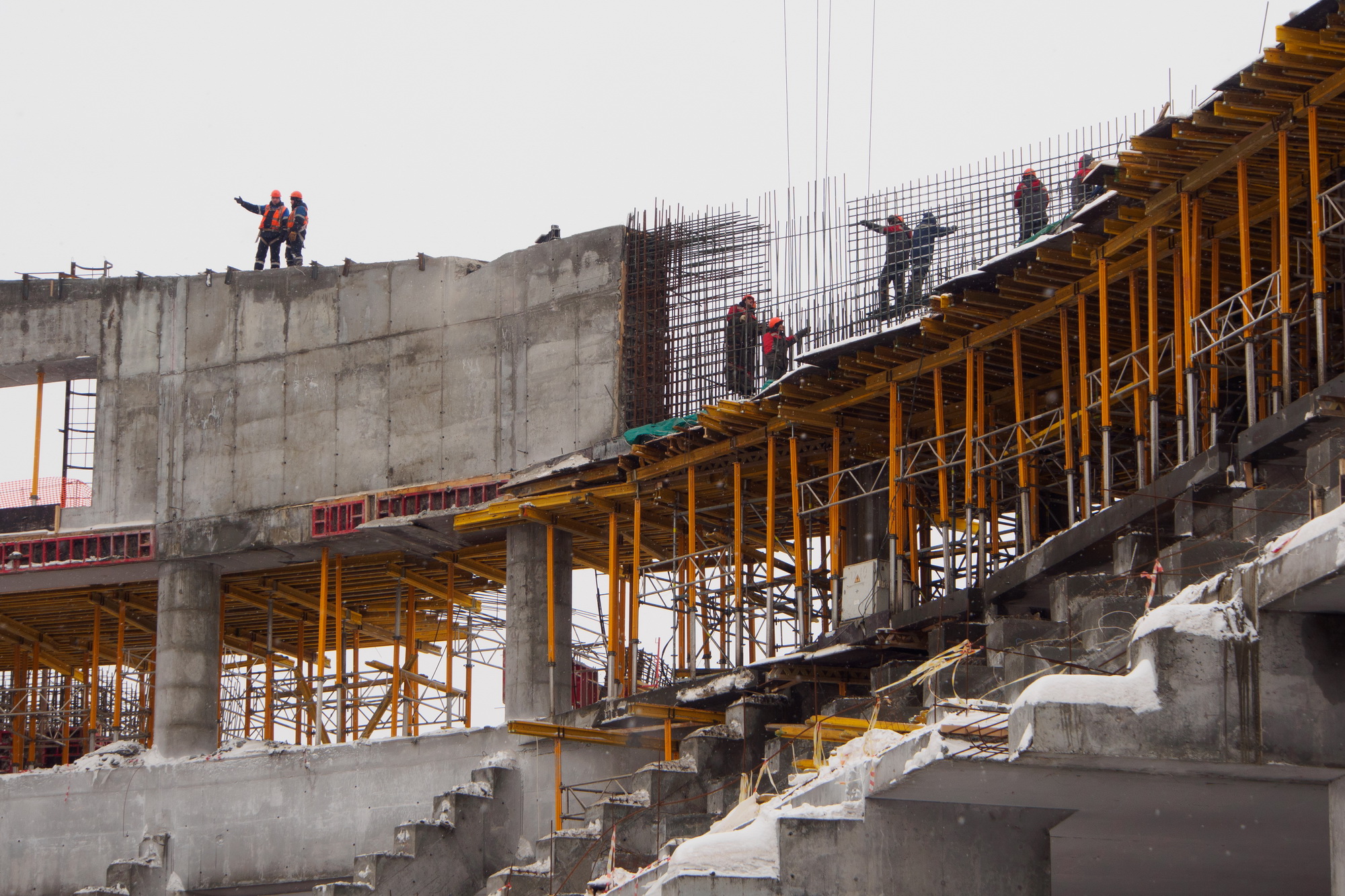 «Эта ледовая арена относится к уникальным объектам: здесь большепролётные металлические конструкции, много монолитных работ. Уже «принято» свыше 68 тысяч кубометров бетона. К концу марта мы должны закончить конструктив основанного здания и подниматься на вспомогательные конструктивы, такие как лестничные клетки, силовые полы», — сказал директор по строительству ООО «ЭлинАльфа» Денис Синюк.