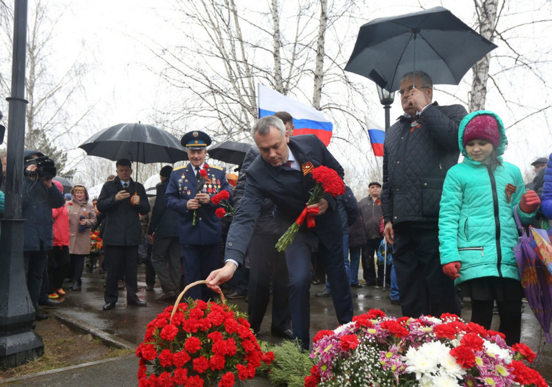 Накануне Дня Победы в мемориал «Аллеи Славы» в Пашинском сквере вписали 56 новых имен. Андрей Травников присутствовал на торжественном митинге.