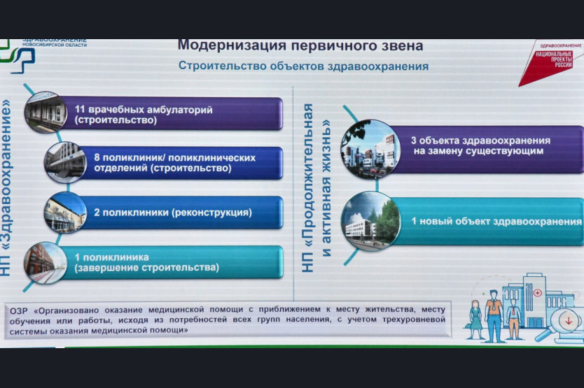 В 2024 году был завершен первый этап модернизации первичного звена. Всего за четыре года в Новосибирской области появились 22 новых объекта здравоохранения: 11 новых врачебных амбулаторий - в поселках Кудряшовский, Мичуринский, Садовый, Ложок, Тулинский, Октябрьский, в селах Каменка, Новолуговое, Верх-Тула, в рабочем поселке Дорогино, на станции Мочище, восемь новых поликлиник и поликлинических отделений - в микрорайонах Новосибирска, «Олимпийская слава», «Стрижи», «Новомарусино», в селах Довольное и Криводановка, в рабочем посёлке Краснообск. В прошедшем году завершено строительство поликлиник в городах Обь и Чулым, реконструкция поликлиник в Колывани и Краснозёрском. С целью дальнейшего улучшения условий оказания первичной медико-санитарной помощи, в 2025 году регион приступает к реализации второго этапа модернизации первичного звена.