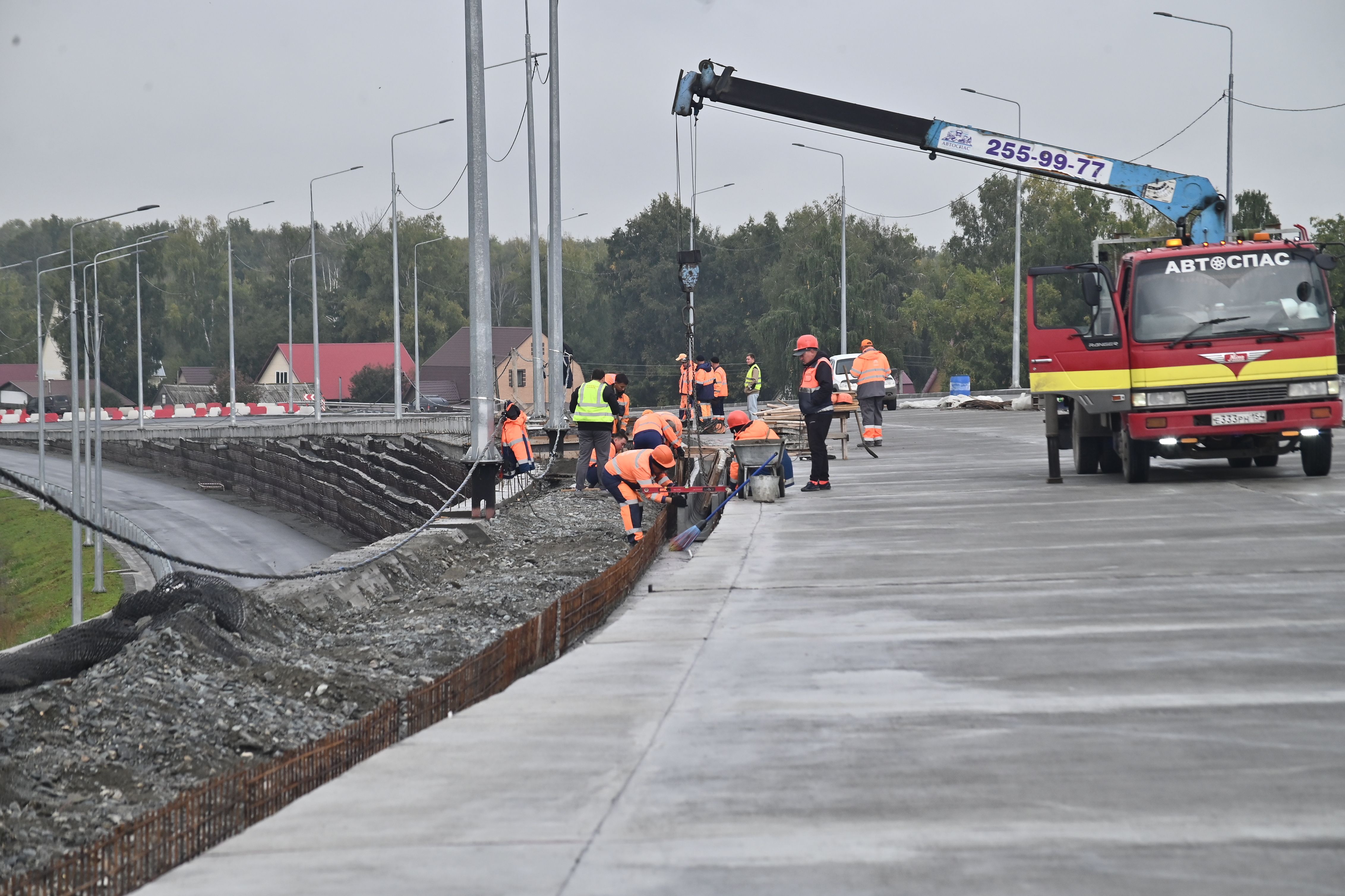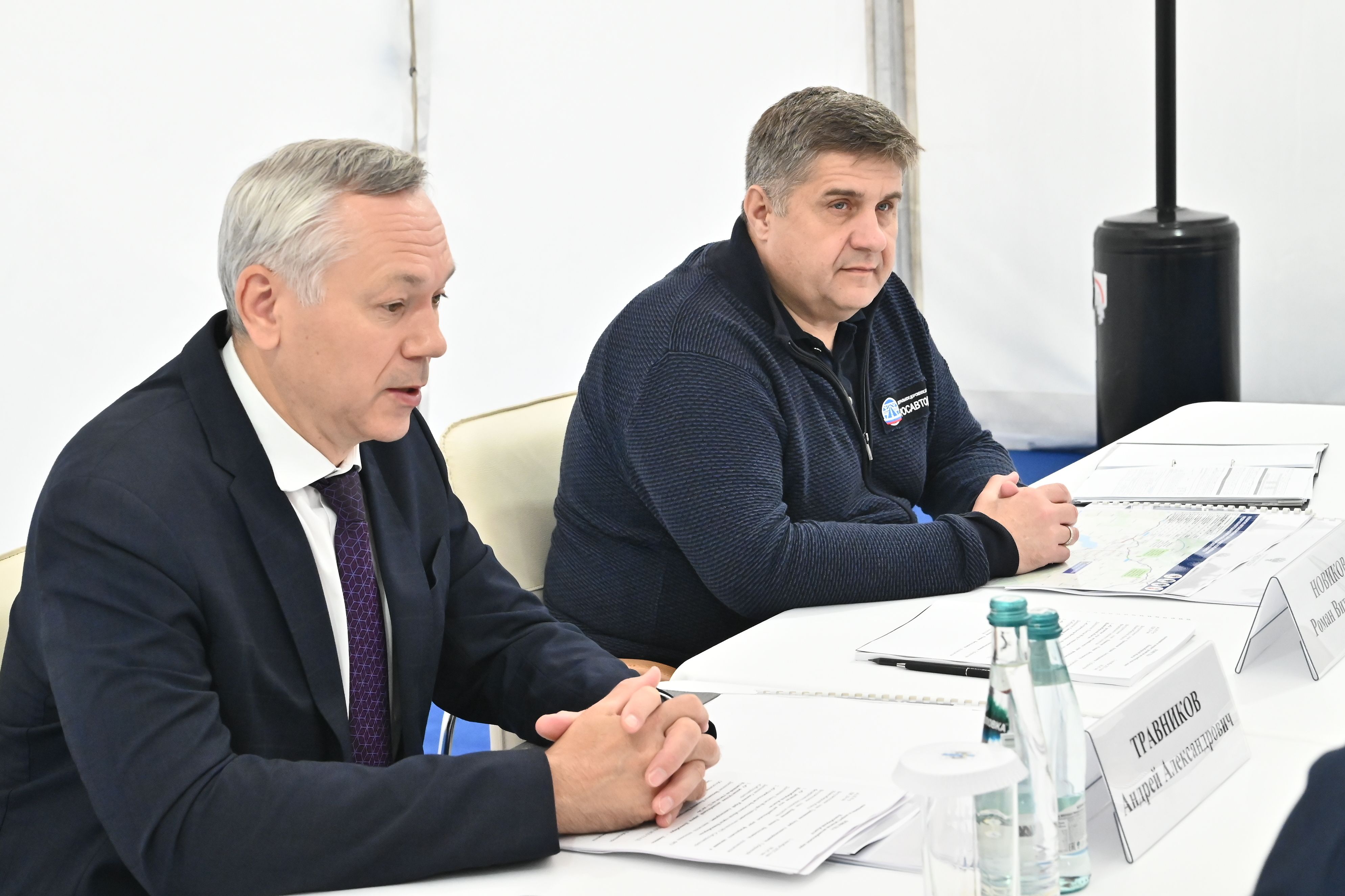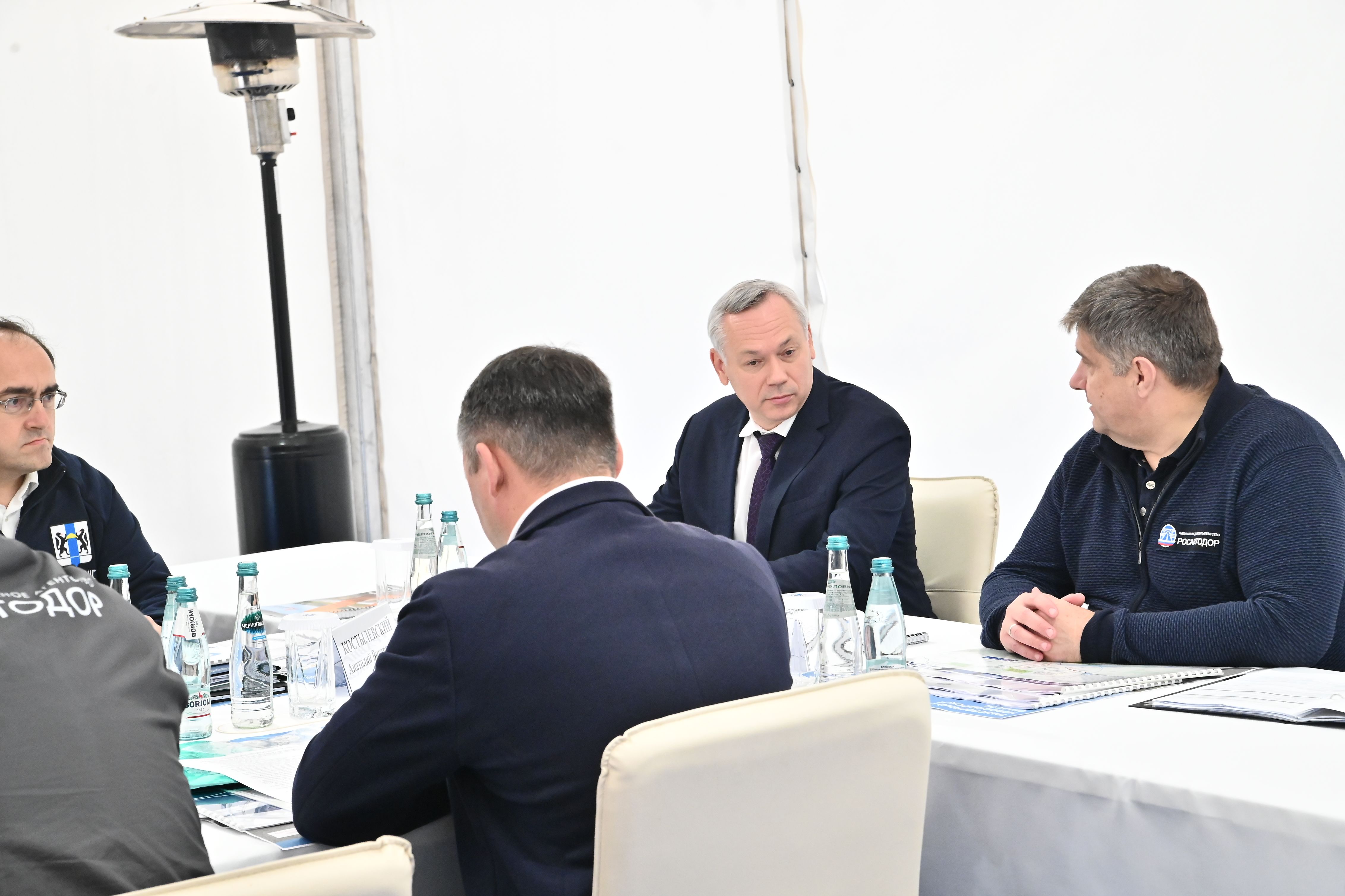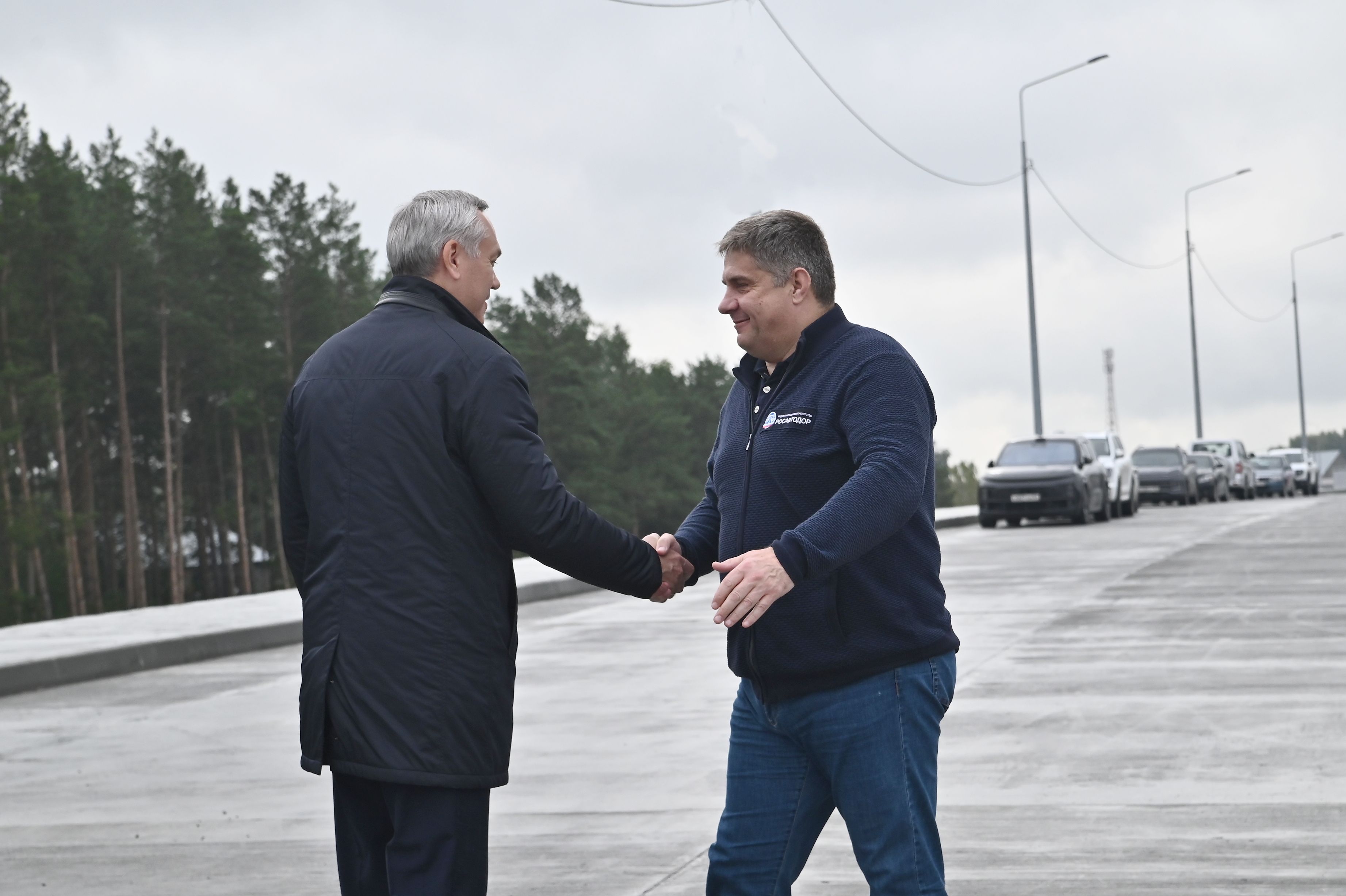 Андрей Травников и руководитель Федерального дорожного агентства Роман Новиков провели выездное совещание на строящейся эстакаде транспортной развязки у въезда в село Раздольное.