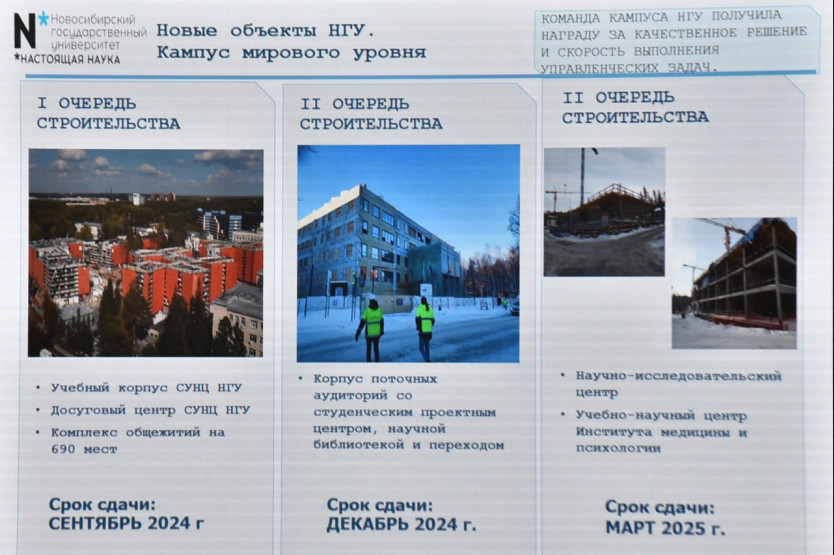 Отметим, что при поддержке Президента и Правительства Российской Федерации, университеты Новосибирской области активно развивают свою инфраструктуру. За последние пять лет введено в эксплуатацию и открыто в университетах региона более 10 объектов. Например, в 2022 году в Новосибирском государственном университете экономики и управления введено общежитие на 403 места, в 2023 году в Новосибирском государственном техническом университете – общежитие на 790 мест, Новосибирский государственный университет продолжает строительство учебного кампуса общей площадью более 79 тыс. кв. метров.