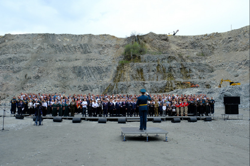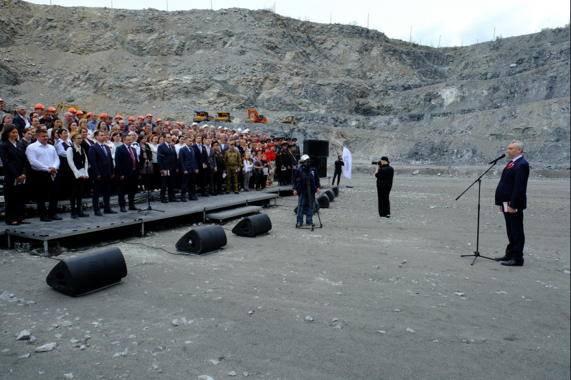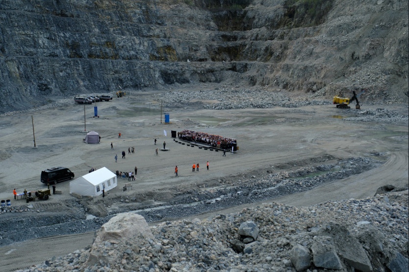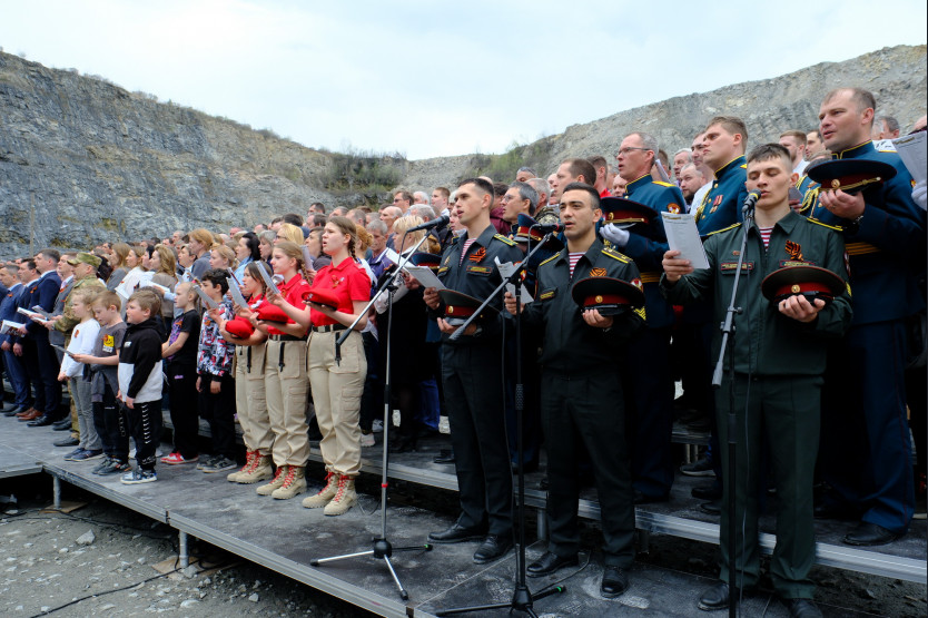 Внутри карьера «Борок», на глубине 110 метров, хор, состоящий более чем из трехсот голосов, включая детские, исполнил песни Победы.