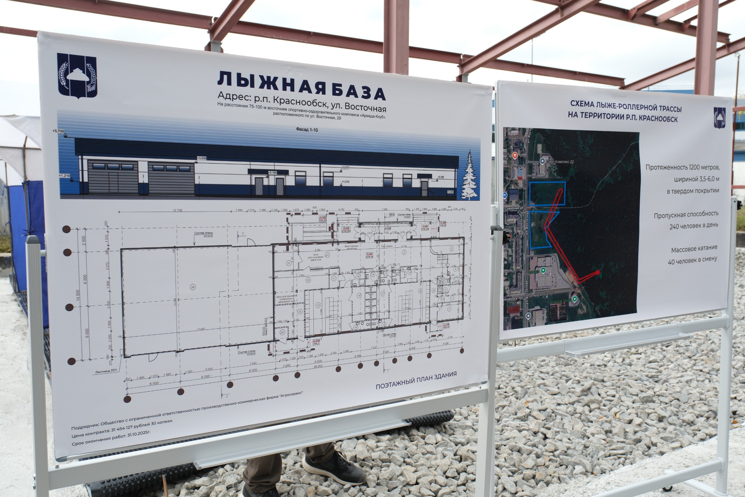 Строительство здания лыжной базы по ул. Восточная в р.п. Краснообск ведется с 2023 года. На объекте выполнены общестроительные и электромонтажные работы, подготовлен водопровод и канализация, отопление и вентиляция, системы связи, пожароохранная сигнализация.