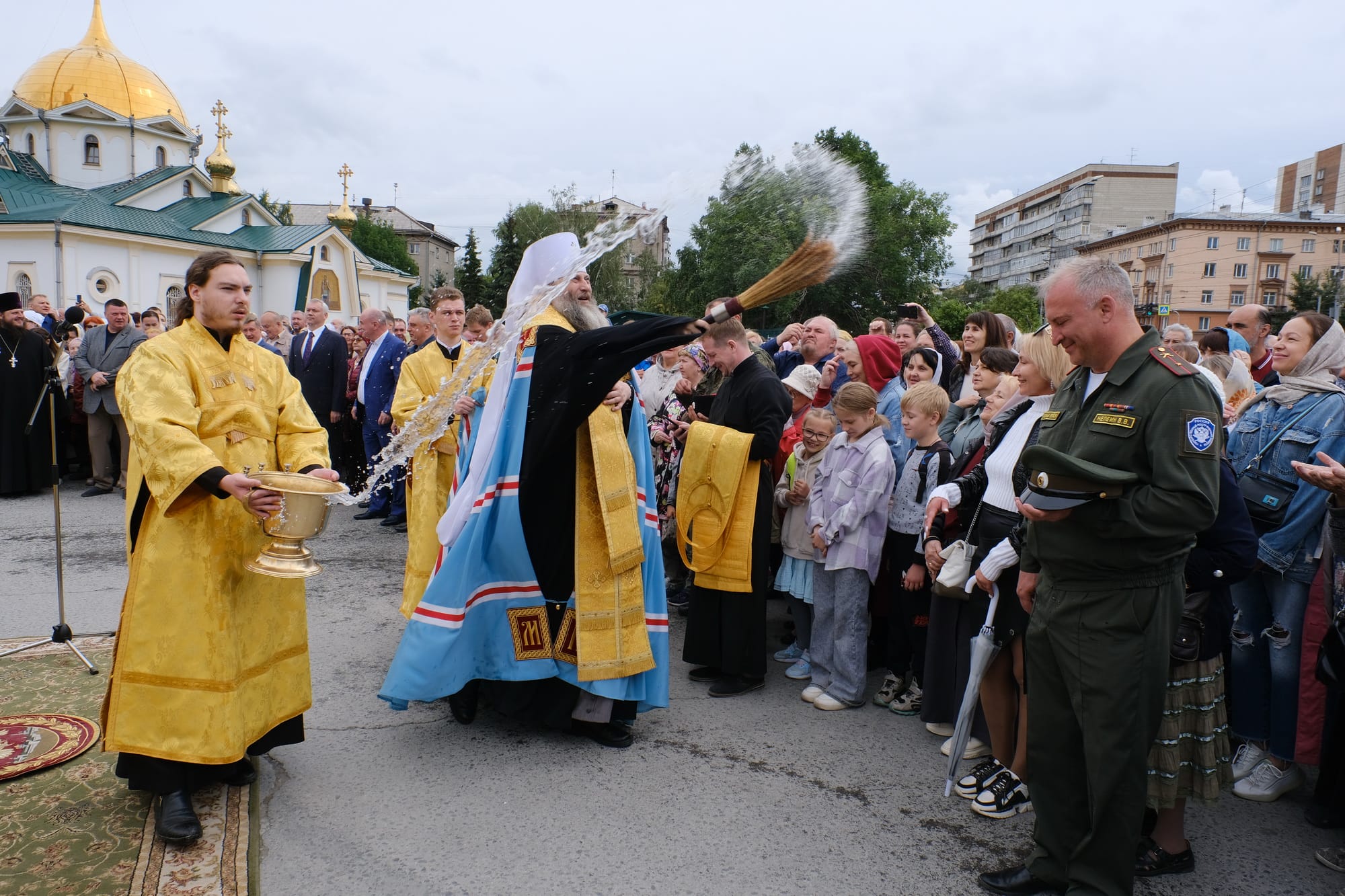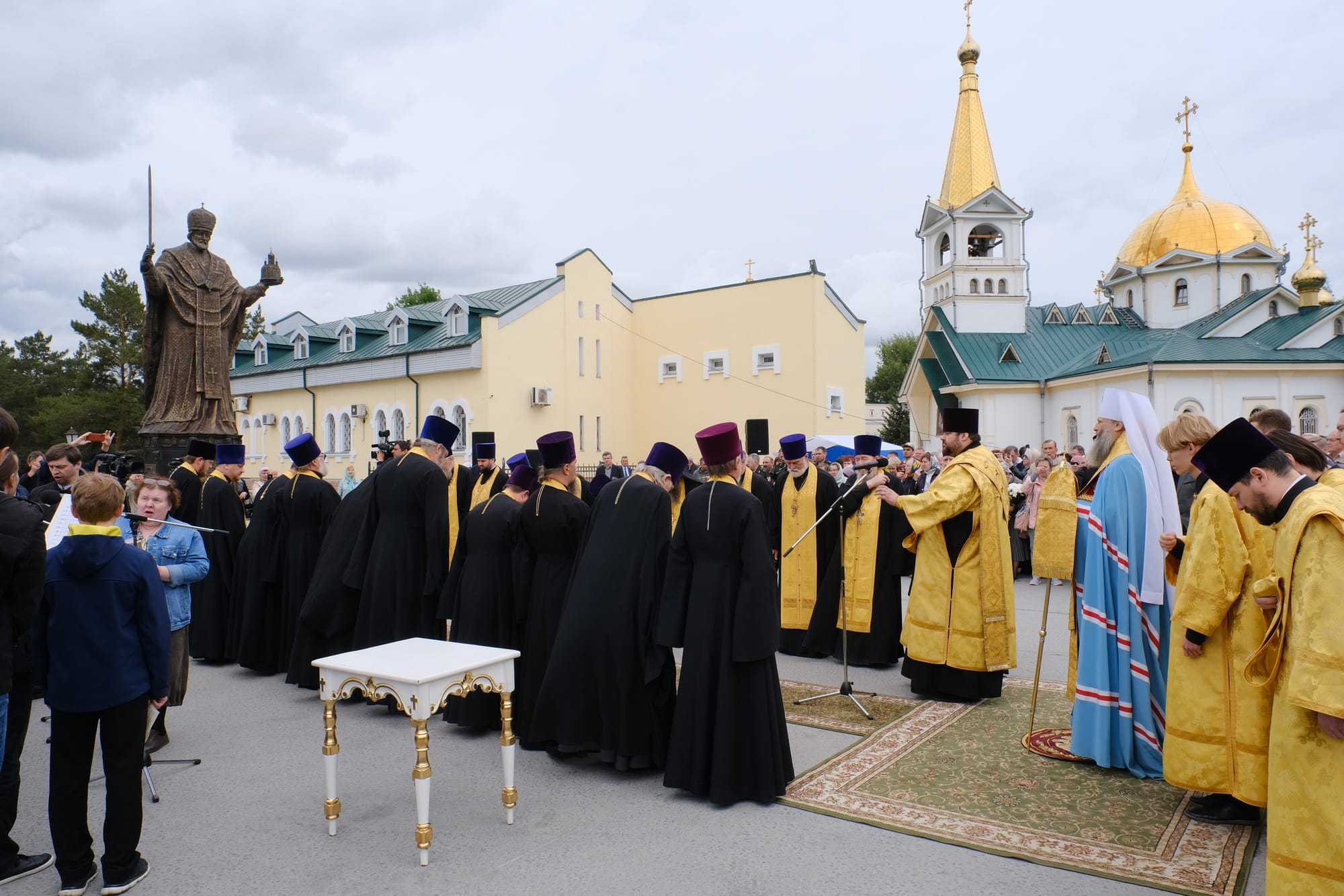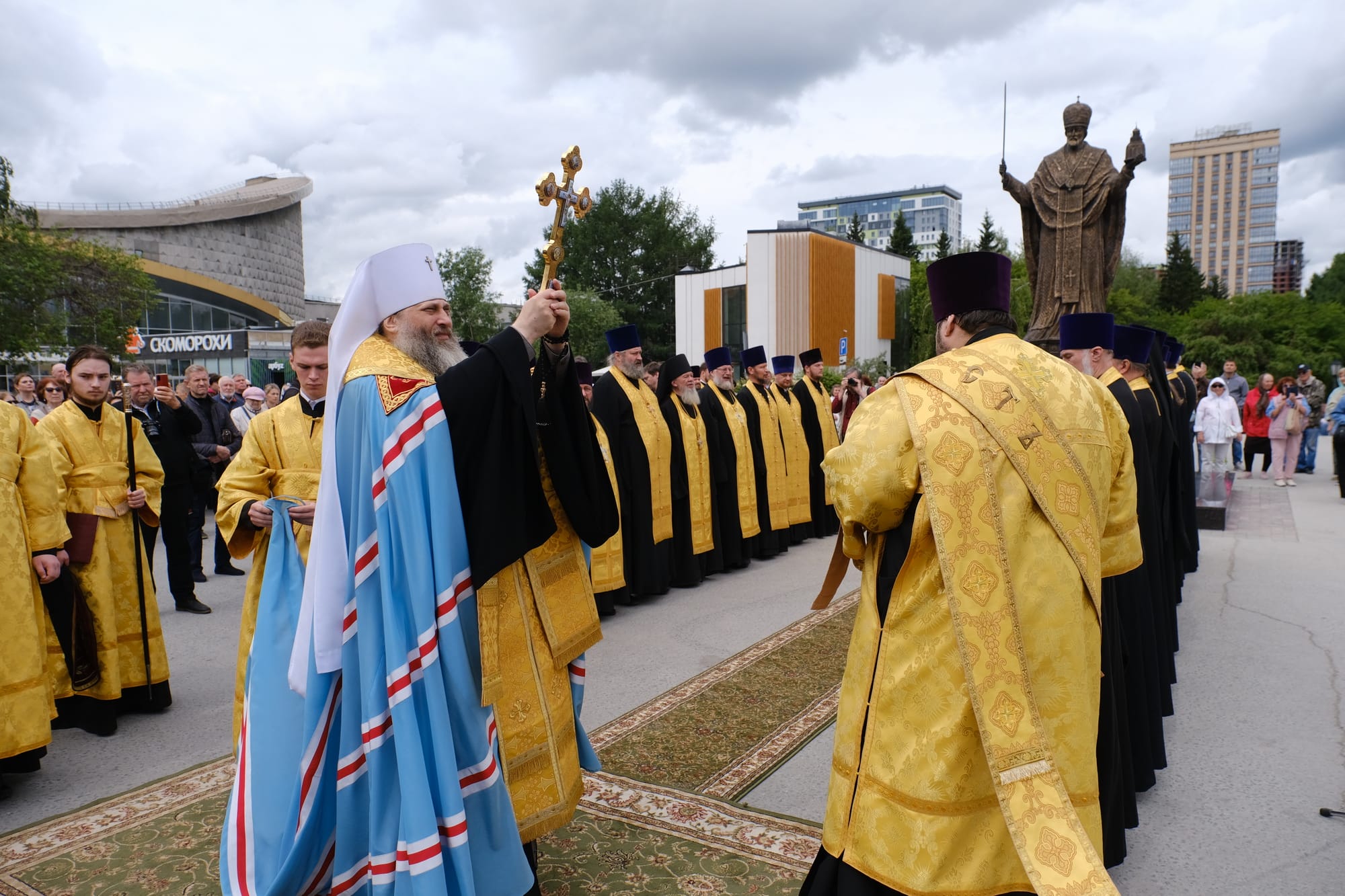 Открытию памятника Святителю Николаю Чудотворцу предшествовал торжественный молебен с чином освящения, который провел Митрополит Новосибирский и Бердский Никодим.