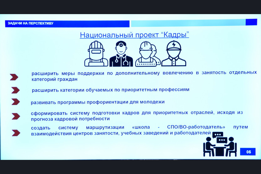 «Региональные проекты и меры государственной поддержки в сфере занятости в текущем году ориентированы на удовлетворение потребности работодателей в кадрах, повышение эффективности использования и перераспределение существующих трудовых ресурсов. Используется система краткосрочного обучения и переобучения взрослого населения по востребованным на рынке труда компетенциям. Здесь кроме региональной программы «Содействие занятости населения» задействованы ресурсы национального проекта «Демография».