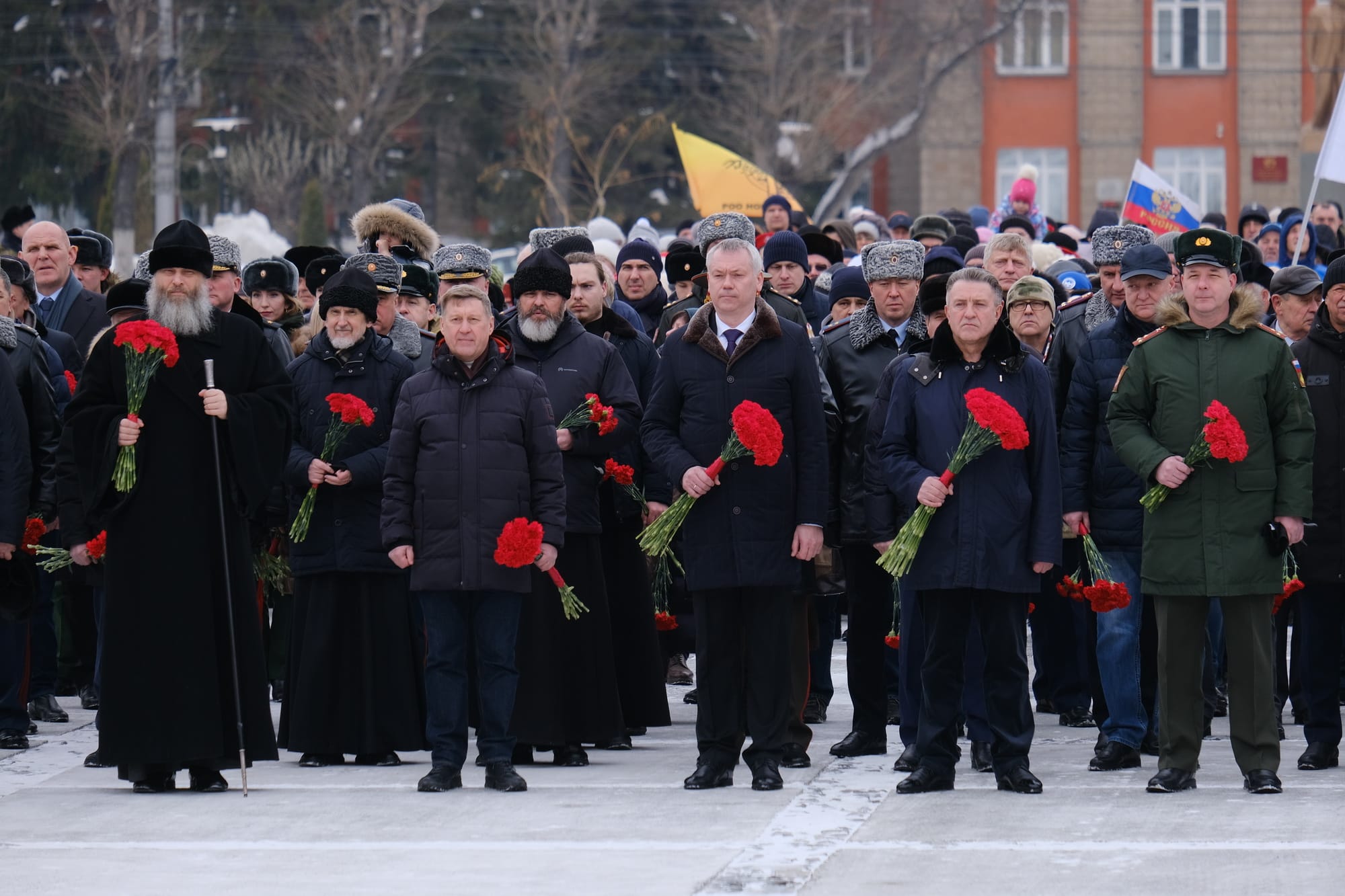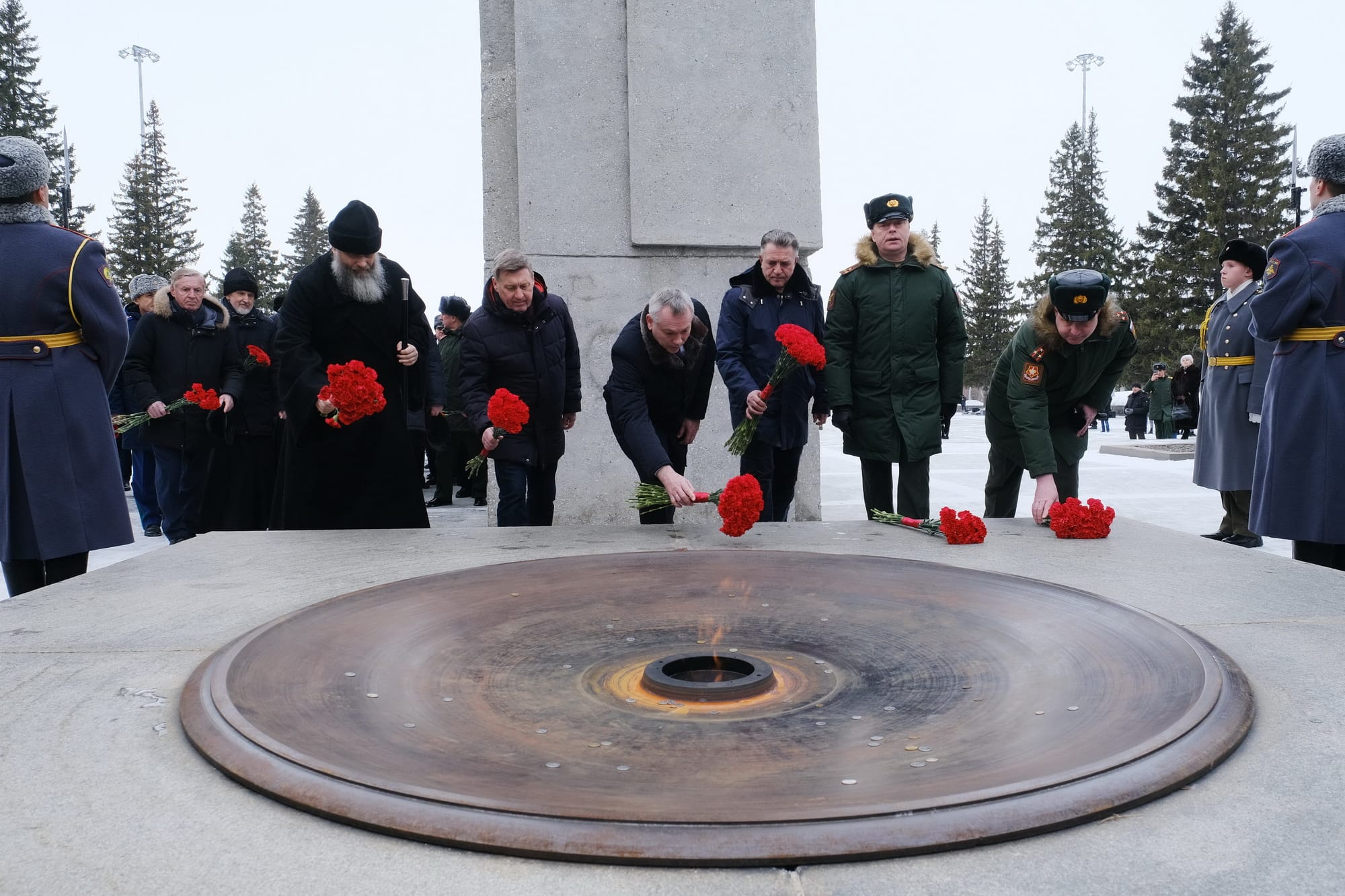 Губернатор Андрей Травников в День защитника Отечества возложил цветы к Вечному Огню на Монументе Славы