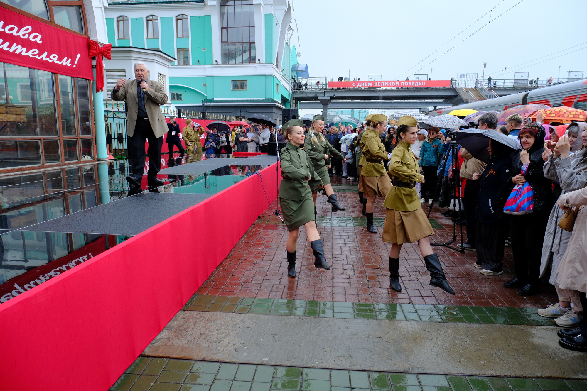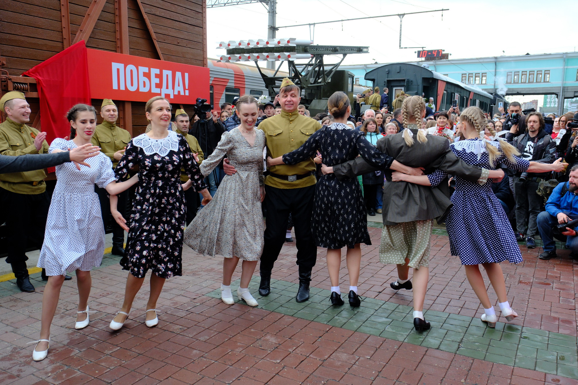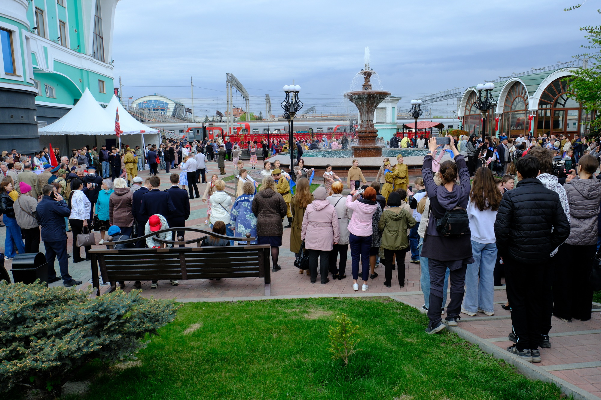 Перед прибытием эшелона рядом с пригородным вокзалом прошла тематическая акция «Вальс Победы». Также в этот день у вокзала работают интерактивные тематические площадки, фотозоны, мастер-классы. Волонтеры раздают копии выпуска газеты «Гудок» 1945 года.