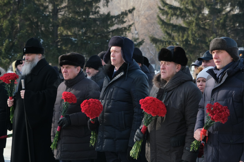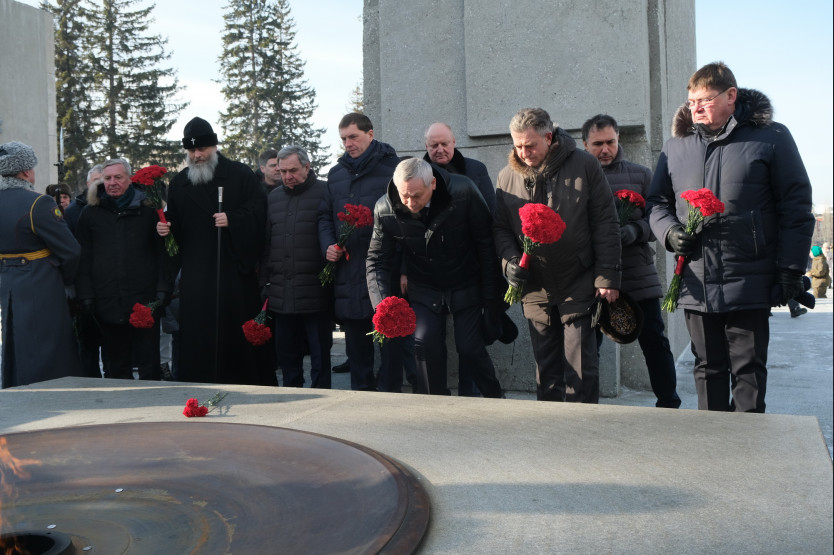 Губернатор Новосибирской области Андрей Травников, Председатель Законодательного Собрания региона Андрей Шимкив, Сенатор Российской Федерации Владимир Городецкий, Митрополит Новосибирский и Бердский Никодим, Прокурор Новосибирской области Александр Бучман и другие официальные лица возложили цветы к Вечному огню на Мемориальном ансамбле «Монумент Славы» на ул. Станиславского.