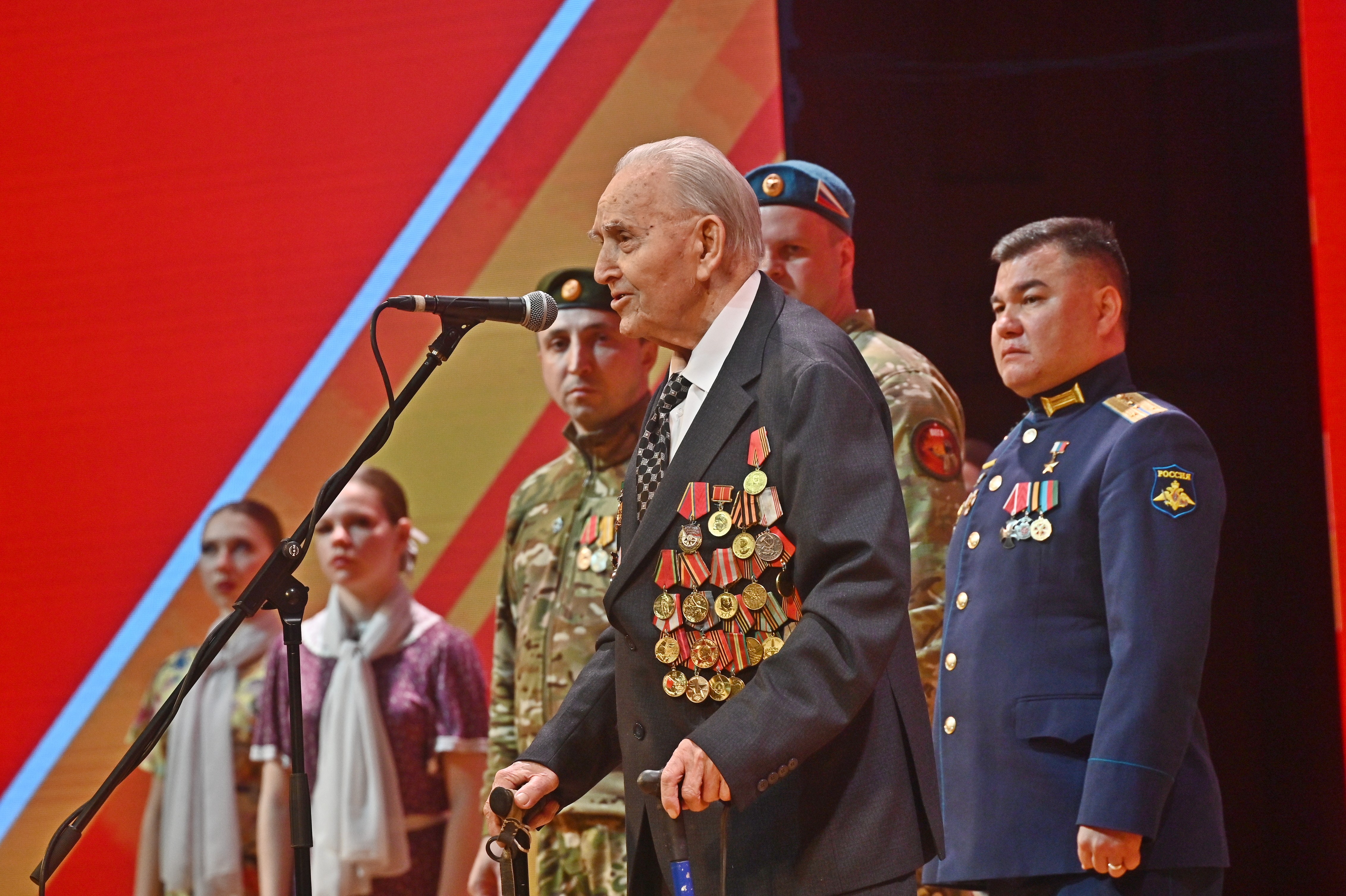 Владимир Сайбель от имени всех участников специальной военной операции поблагодарил ветерана, добавив, что с глубоким уважением и чувством гордости принимает Знамя Победы.