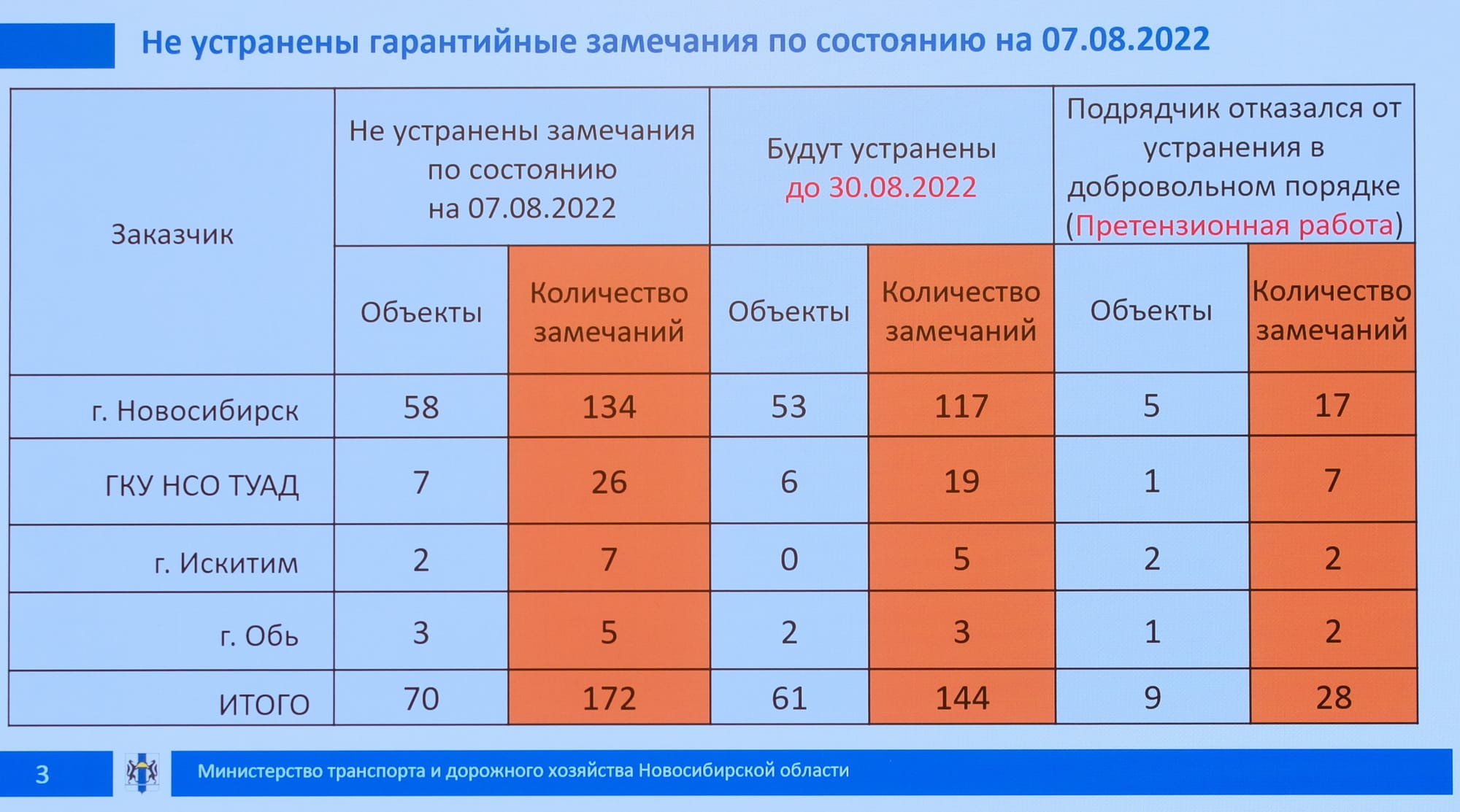 По состоянию на 7 августа 2022 устранены замечания на 163 объектах (405 замечаний), не устранены – на 70 объекте (172 замечаний), в том числе: на 58 объектах г. Новосибирска (134 замечаний), 7 объектах ГКУ НСО ТУАД (26 замечаний) на 2 объектах г. Искитима (7 замечаний) и на 3 объектах г. Оби (5 замечаний).