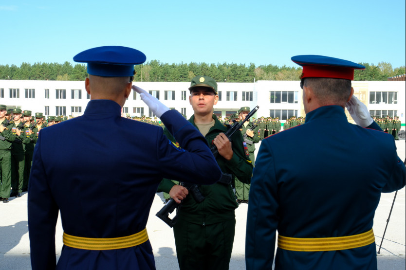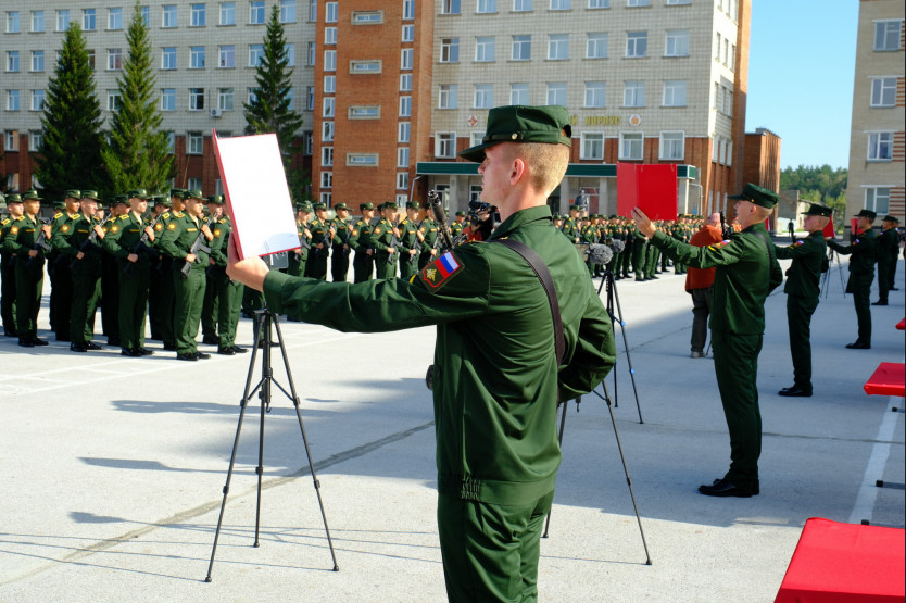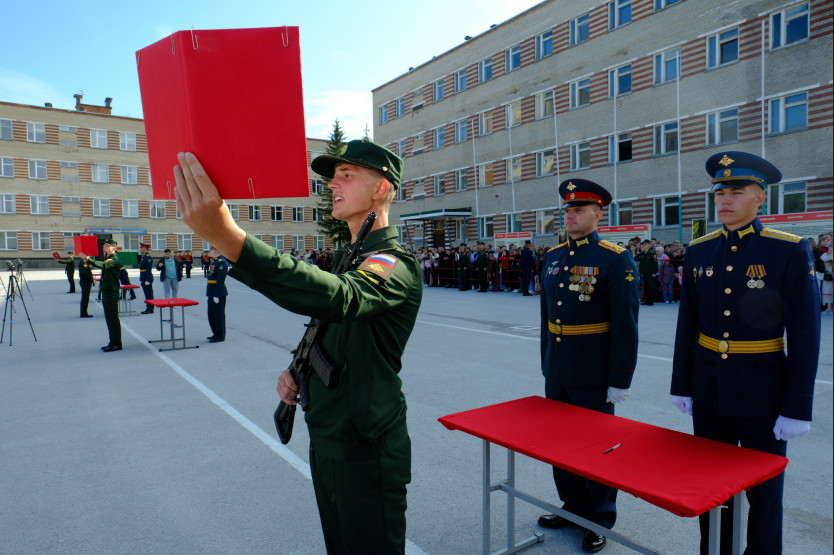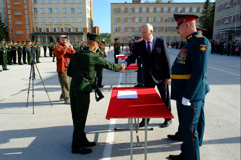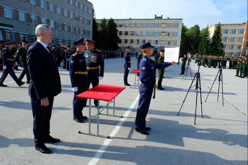 Губернатор Андрей Травников, начальник Новосибирского высшего военного командного ордена Жукова училища Роман Титов приняли участие в церемонии принятия военной присяги курсантами первого курса.