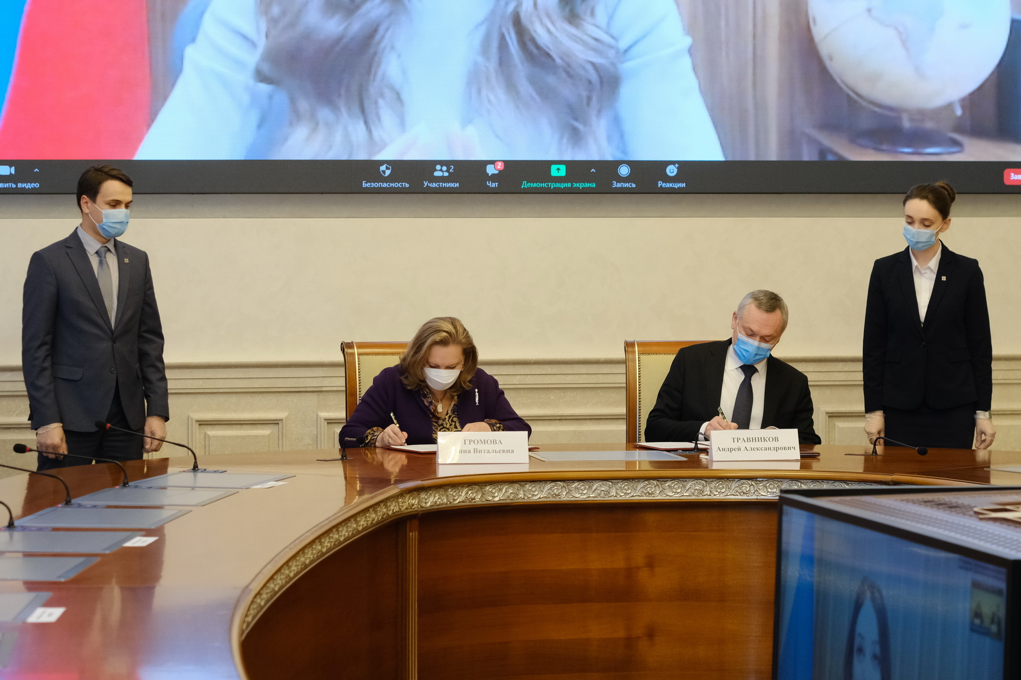 Подписи под документом поставили губернатор Андрей Травников, руководитель Федерального агентства по туризму РФ Зарина Догузова (в режиме ВКС), председатель наблюдательного совета Фонда ЕСПО Анна Громова в присутствии Митрополита Новосибирского и Бердского Никодима.