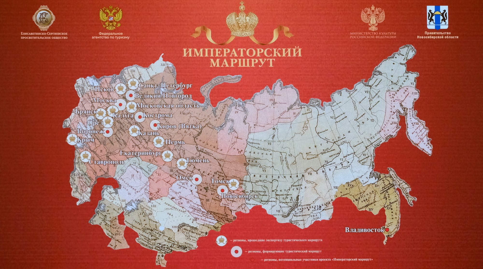 В 2018 году «Императорский маршрут» объединил девять регионов России: Санкт-Петербург, Москву, Московскую область, Тюменскую, Свердловскую, Омскую, Томскую, Псковскую и Кировскую области.