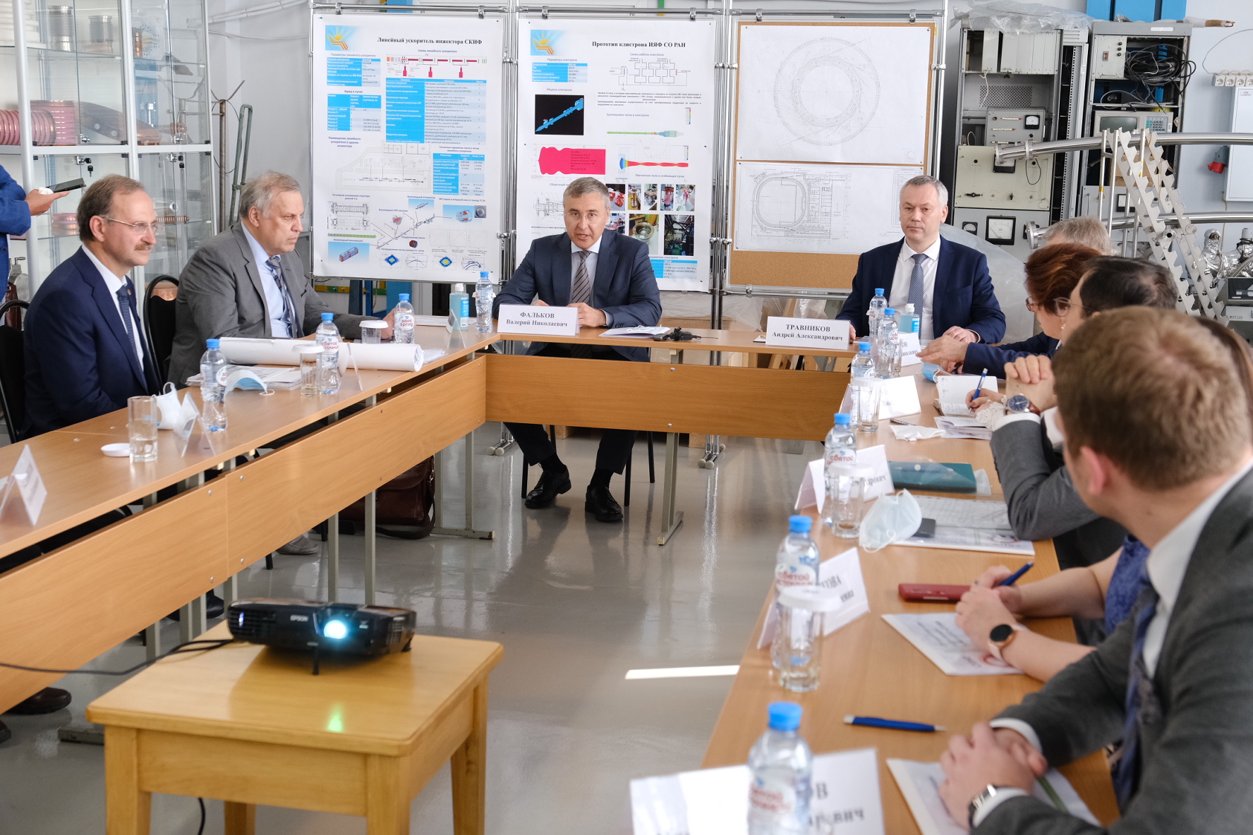 В ходе посещения экспериментального производства Министр поручил рассмотреть возможность модернизации опытного производства ИЯФ СО РАН и других опытных производств. «Сейчас вы работаете в рамках контракта по производству элементов установки класса мегасайенс FAIR для наших партнеров в Германии. Следующий этап – производство оборудования для ЦКП «СКИФ». Впереди нас ждет строительство еще нескольких установок класса мегасайенс. Поэтому, наверное, логично ставить вопрос о модернизации производственных мощностей ИЯФ СО РАН, и запускать некую программу на несколько лет, чтобы это было производство XXI века, потому что постановка вопроса о модернизации назрела. Прошу рассмотреть модернизацию не только опытного производства ИЯФ СО РАН, но и в целом всех опытных производств, так мы должны успешно реализовать Федеральную научно-техническую программу до 2027 года», – сказал Валерий Фальков.