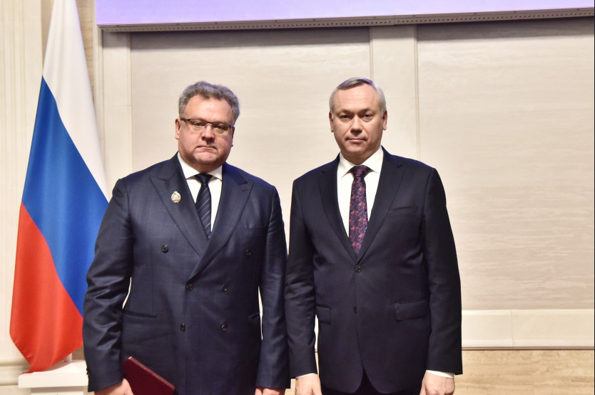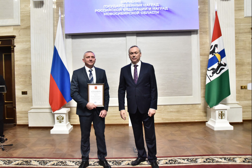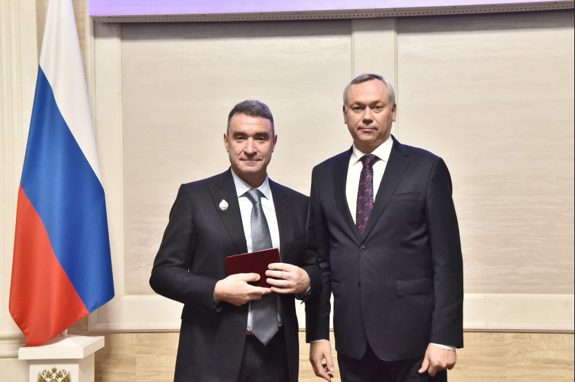 С присвоением почётного звания «Заслуженный работник оборонно-промышленного комплекса РФ» Губернатор поздравил директора филиала ПАО «Объединенная авиастроительная корпорация» — Новосибирский авиационный завод имени В.П. Чкалова» Сергея Панасенко.