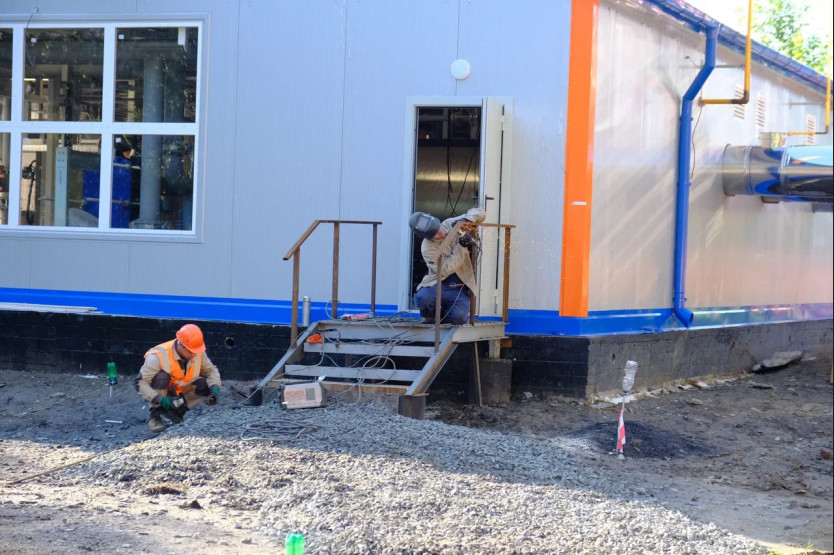 Блочно-модульная котельная доставлена на строительную площадку, смонтирована, ведется внутренняя обвязка оборудования и наладка автоматики. Дизельный электрогенератор также доставлен на площадку. Выполняются работы по наружным тепловым сетям, проколу внутриплощадочных газовых сетей, смонтирована ферма дымовых труб, начат их монтаж.