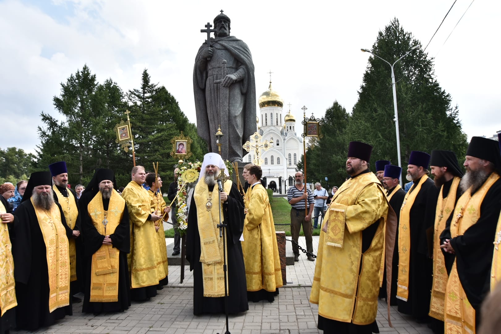 Митрополит Новосибирский и Бердский Никодим напомнил, что великий государственный деятель, креститель земли русской равноапостольный князь Владимир до обращения в веру был язычником и гонителем христиан, – «ибо не была его душа просвещена словом благим. Но вот благодать Божия касается и его сердца – он приходит для того, чтобы принять крещение не только самому, но и крестит всю Русь. Что была тогда Русь? Различные племена, обычаи и верования, друг с другом воевали, друг друга били. И вот эти языческие племена, войдя в святую купель, выходят из неё уже Русью Святой – единым народом, единой страной. Это единство заповедано всем нам. Прошли века, неоднократно Русь Святая подвергалась нападкам тех, кто завидует нашей стране, её богатствам и её неповреждённой вере, доставшейся нам от предков. Сегодня мы с горестью видим, как вновь идут нападки на Святую Русь, и вынуждены защищать её с оружием в руках. Много в истории испытали зла, и это зло мы победим!» – подчеркнул Митрополит.