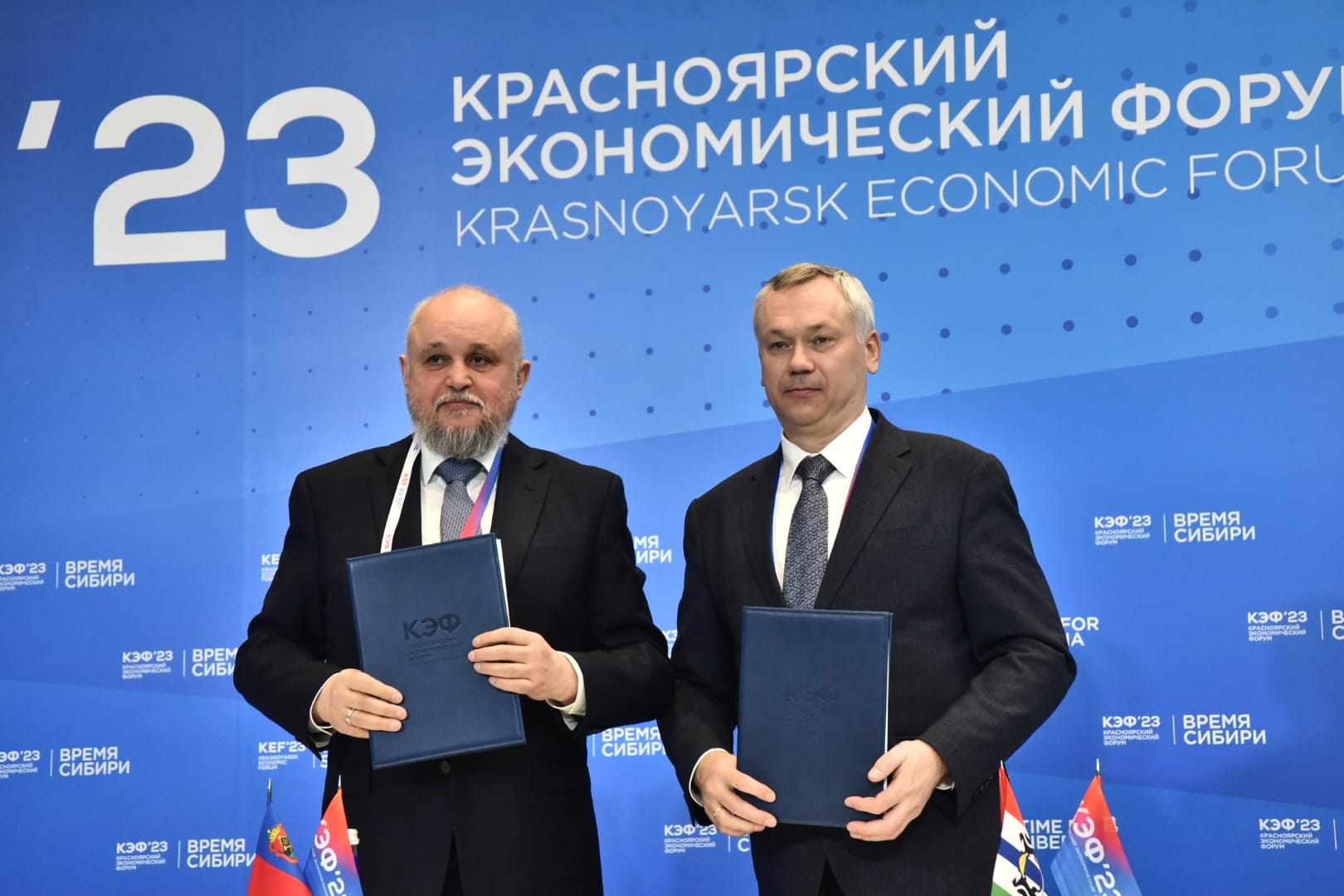 Губернаторы Новосибирской и Кемеровской областей Андрей Травников и Сергей Цивилёв подписали в рамках Красноярского экономического форума-2023 план мероприятий по реализации соглашения между Правительством Новосибирской области и Коллегией Администрации Кемеровской области о сотрудничестве в торгово-экономической, научно-технической, культурной и иных сферах.