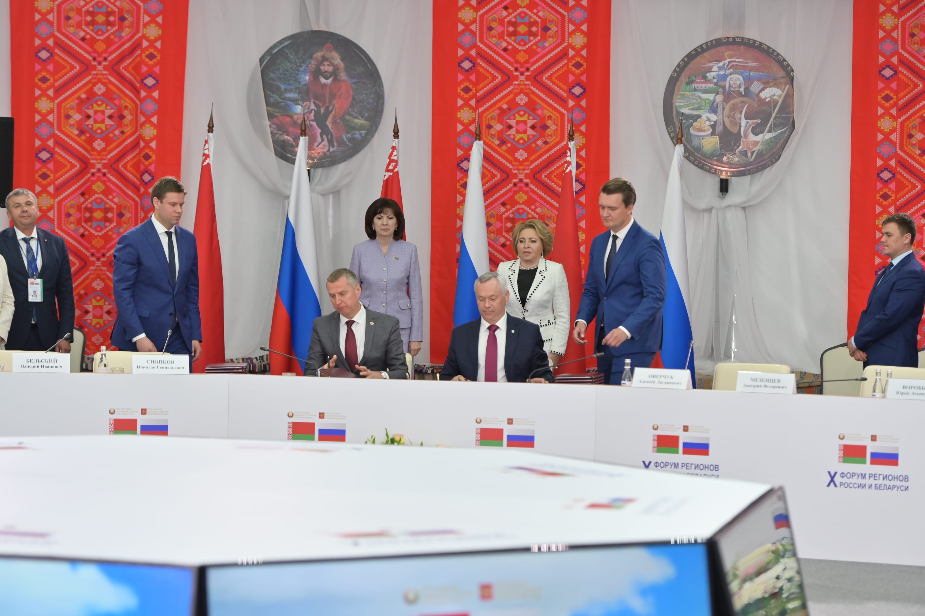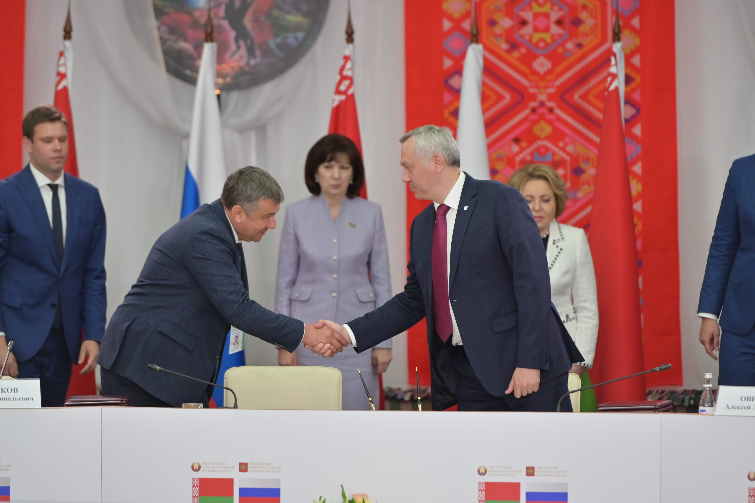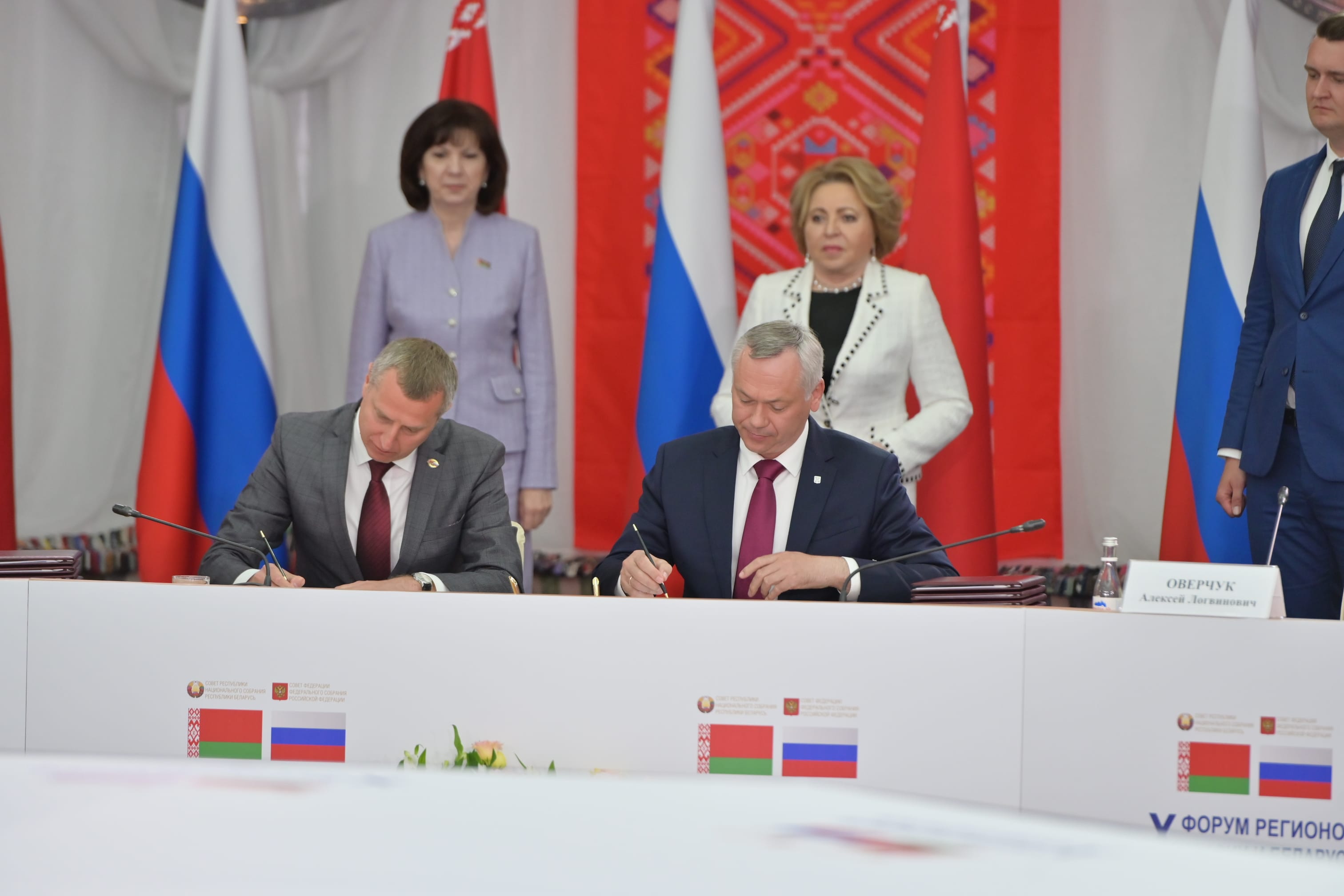 Самое первое соглашение, что особенно отметила Валентина Матвиенко, заключено между Правительством Новосибирской области и Правительством Республики Беларусь о торгово-экономическом, научно-техническом и социально-культурном сотрудничестве. Подписи под документом поставили Губернатор Андрей Травников и Чрезвычайный и Полномочный Посол Республики Беларусь в Российской Федерации Дмитрий Крутой.