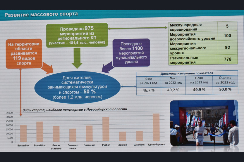По словам министра, в 2023 году наша область поставила рекорды по ряду направлений: более ста спортивных объектов введено, реконструировано и оснащено оборудованием. Более 67000 человек приняли участие в выполнении нормативов ГТО, более 4500 медалей завоёвано новосибирскими спортсменами; прошло 975 спортивных и физкультурно-массовых мероприятий, в которых приняли участие более 180 тысяч человек.