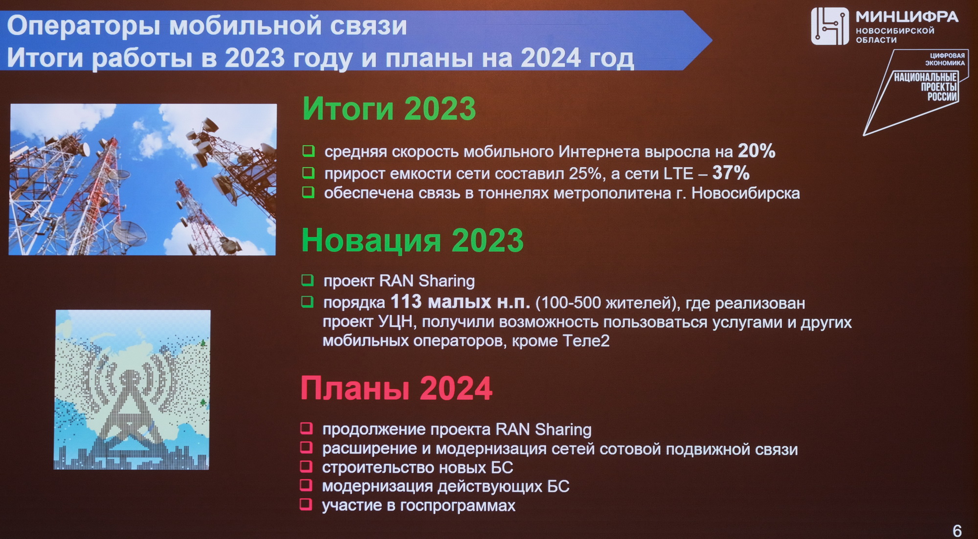 В 2023 году за счёт средств регионального и федерального бюджетов удалось обеспечить сотовой связью и мобильным широкополосным доступом к интернету рекордное число населённых пунктов – 76. В 6 муниципальных районах 100% жителей обеспечены сотовой связью и мобильным интернетом (Доволенский, Здвинский, Кочковский, Новосибирский, Маслянинский, Болотнинский). По итогам обеспечения в 2024 году ещё 64 населённых пункта сотовой связью все муниципальные образования региона будут обеспечены сотовой связью и мобильным интернетом не менее чем на 86%.