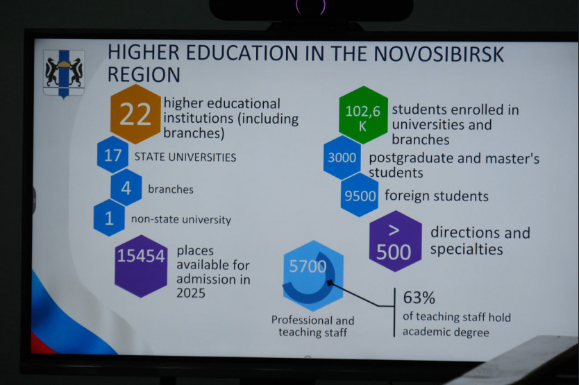 Губернатор отметил: В Новосибирской области работают 22 вуза, почти 50 исследовательских институтов, которые ведут фундаментальные и прикладные разработки. Они представляют как Российскую Академию наук, так и различные отрасли экономики. Обучение идёт более чем по 500 направлениям и специальностям. Очень сильное медицинское, естественно-научное, инженерное, военное, информационно-телекоммуникационное и музыкальное образование.