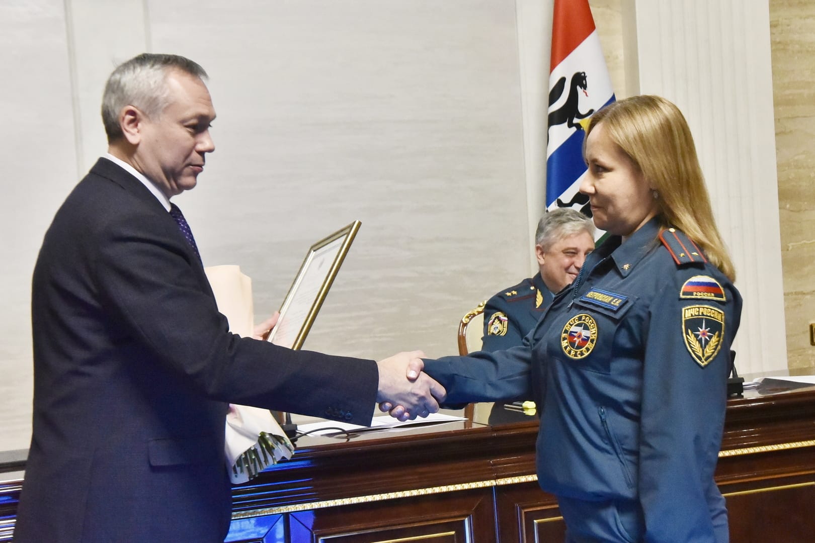Отличившимся сотрудникам МЧС Андрей Травников вручил Почётную грамоту и Благодарственные письма Губернатора Новосибирской области.