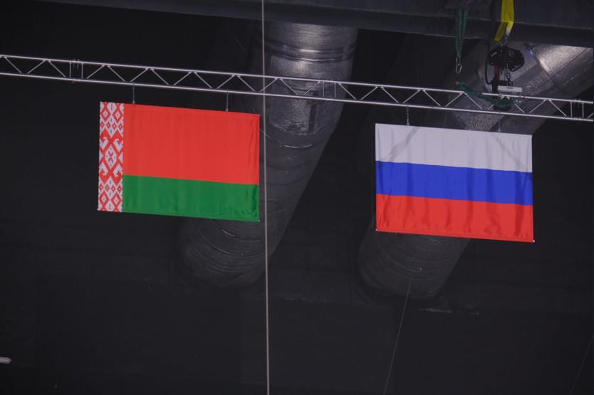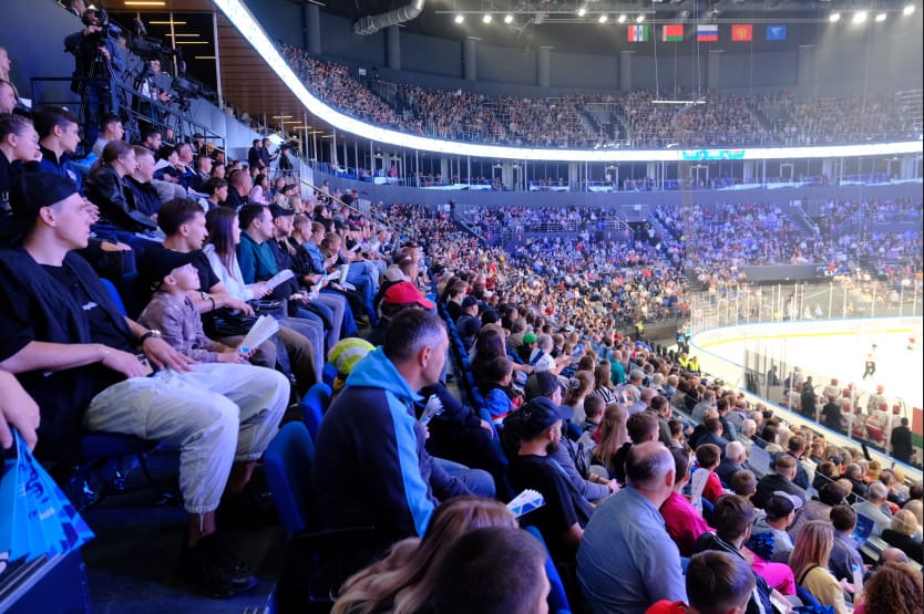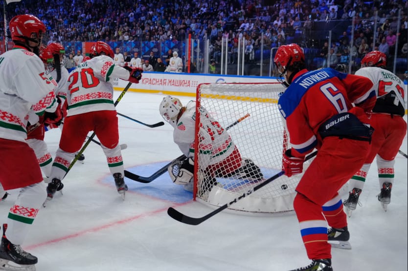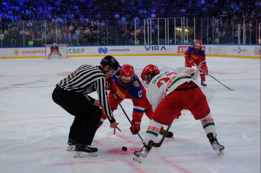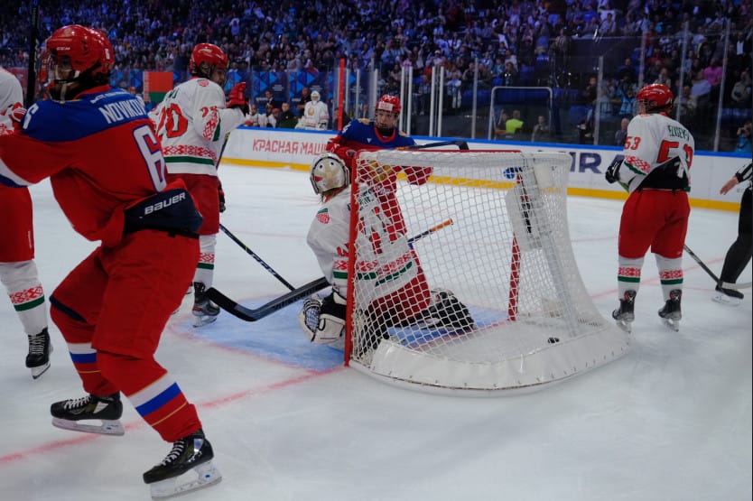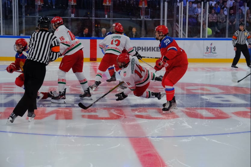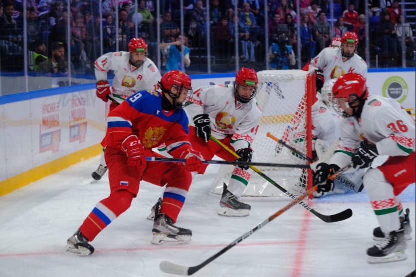 История соревнований на льду нового дворца спорта началась с матча юниорских сборных России и Белоруссии.