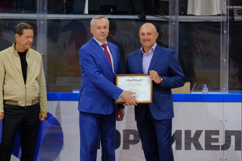 Губернатор Андрей Травников приветствовал болельщиков и участников первой игры на новой арене и вместе с президентом Федерации хоккея России, трёхкратным Олимпийским чемпионом Владиславом Третьяком совершил символическое вбрасывание первой шайбы.