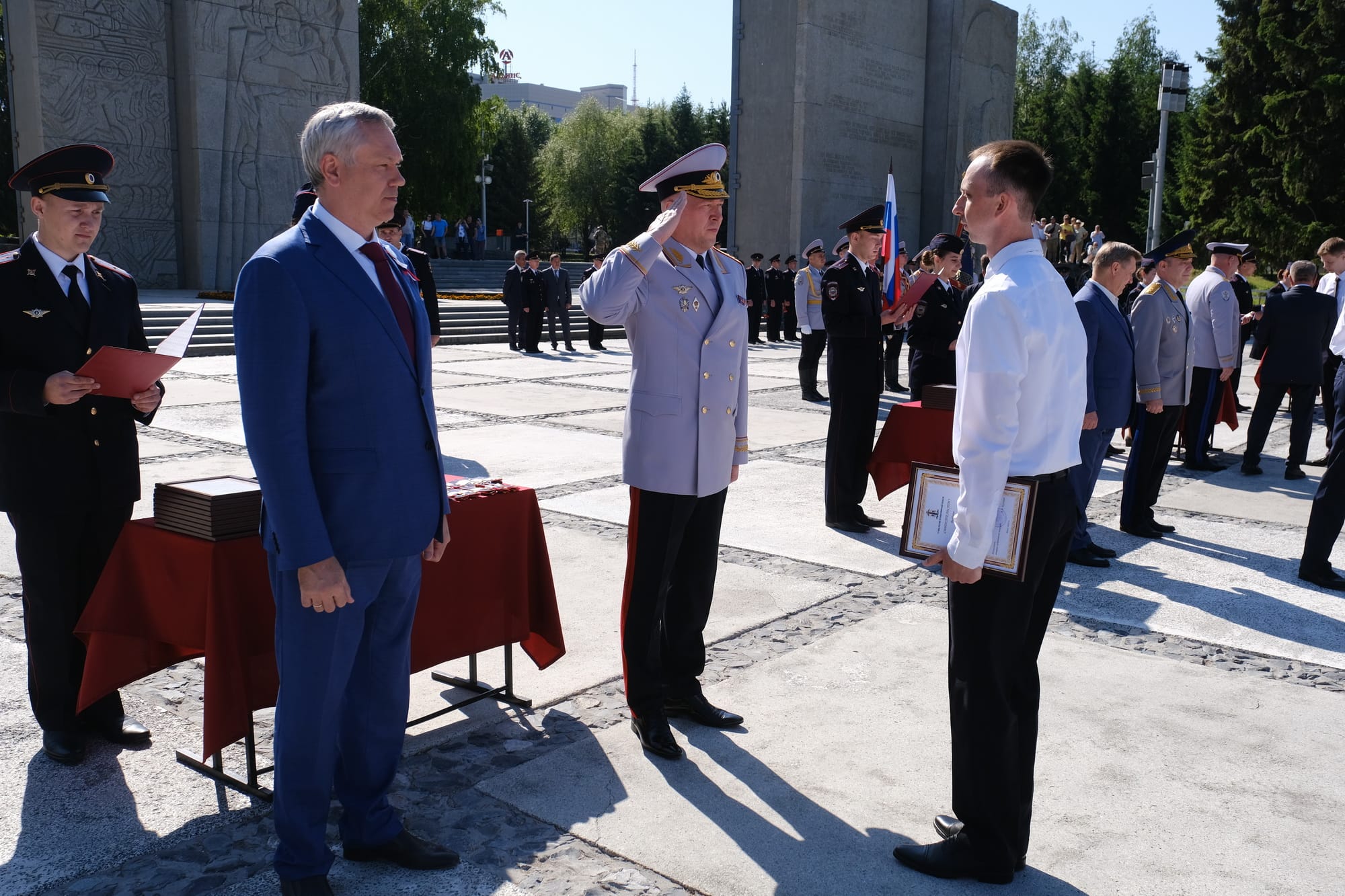 Торжественная церемония вручения погон сотрудникам ГУ МВД России по Новосибирской области прошла в День России на мемориальном комплексе «Монумент Славы». Молодых офицеров, которым присвоены первые специальные звания среднего начсостава, поздравили Губернатор Андрей Травников, начальник ГУ МВД России по Новосибирской области Андрей Кульков.