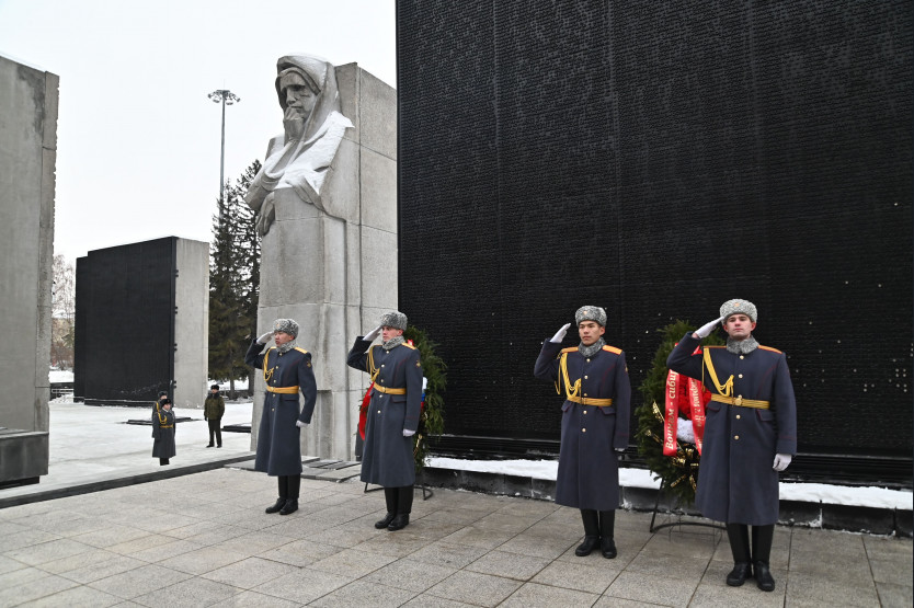 Губернатор Андрей Травников возложил цветы к захоронению праха неизвестного солдата-сибиряка на мемориальном комплексе Монумент Славы.