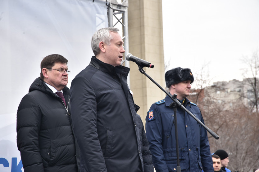 К собравшимся в центре Новосибирска также обратились главный федеральный инспектор по Новосибирской области Николай Буймов, мэр Новосибирска Максим Кудрявцев, командир отряда специального назначения 24 отдельной Гвардейской Ордена Жукова бригады специального назначения Александр Яско.